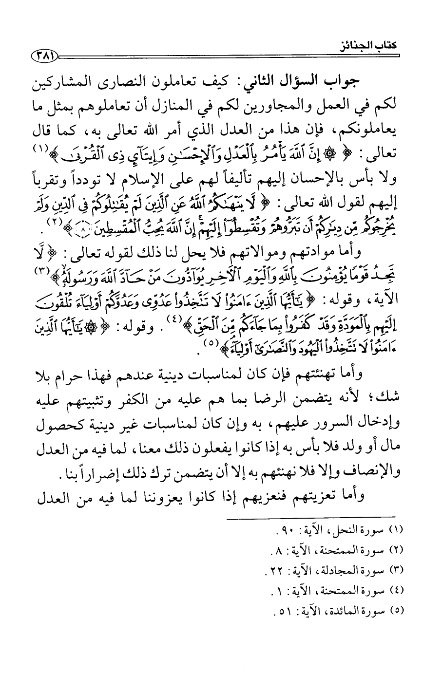 جواب السؤال الثاني: كيف تعاملون النصارى المشاركين لكم في العمل والمجاورين لكم في المنازل أن تعاملوهم بمثل ما يعاملونكم، فإن هذا من العدل الذي أمر الله تعالى به، كما قال تعالى: {إِنَّ اللهَ يَأْمُرُ بِالْعَدْلِ وَالإْحْسَانِ وَإِيتَآءِ ذِى الْقُرْبَى وَيَنْهَى عَنِ الْفَحْشَاءِ وَالْمُنْكَرِ وَالْبَغْى يَعِظُكُمْ لَعَلَّكُمْ تَذَكَّرُونَ} ولا بأس بالإحسان إليهم تأليفاً لهم على الإسلام لا تودداً وتقرباً إليهم لقول الله تعالى: {لاَّ يَنْهَاكُمُ اللهُ عَنِ الَّذِينَ لَمْ يُقَاتِلُوكُمْ فِى الدِّينِ وَلَمْ يُخْرِجُوكُمْ مِّن دِيَارِكُمْ أَن تَبَرُّوهُمْ وَتُقْسِطُو?اْ إِلَيْهِمْ إِنَّ اللهَ يُحِبُّ الْمُقْسِطِينَ} .