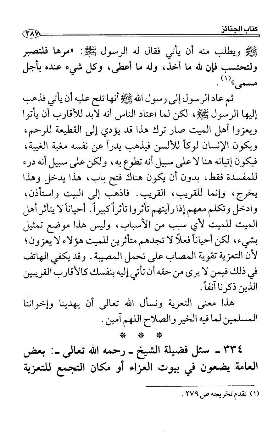ثم عاد الرسول إلى رسول الله صَلَّى اللَّهُ عَلَيْهِ وَسَلَّمَ أنها تلح عليه أن يأتي فذهب إليها الرسول صَلَّى اللَّهُ عَلَيْهِ وَسَلَّمَ، لكن لما اعتاد الناس أنه لابد للأقارب أن يأتوا ويعزوا أهل الميت صار ترك هذا قد يؤدي إلى القطيعة للرحم، ويكون الإنسان لوكاً للألسن فيذهب يدرأ عن نفسه مغبة الغيبة، فيكون إتيانه هنا لا على سبيل أنه تطوع به، ولكن على سبيل أنه درء للمفسدة فقط، بدون أن يكون هناك فتح باب، هذا يدخل وهذا يخرج، وإنما للقريب، القريب. فاذهب إلى البيت واستأذن، وادخل وتكلم معهم إذا رأيتهم تأثروا تأثراً كبيراً. أحياناً لا يتأثر أهل الميت للميت لأي سبب من الأسباب، وليس هذا موضع تمثيل بشيء، لكن أحياناً فعلاً لا تجدهم متأثرين للميت هؤلاء لا يعزون؛ لأن التعزية تقوية المصاب على تحمل المصيبة. وقد يكفي الهاتف في ذلك فيمن لا يرى من حقه أن تأتي إليه بنفسك كالأقارب القريبين الذين ذكرنا آنفاً.