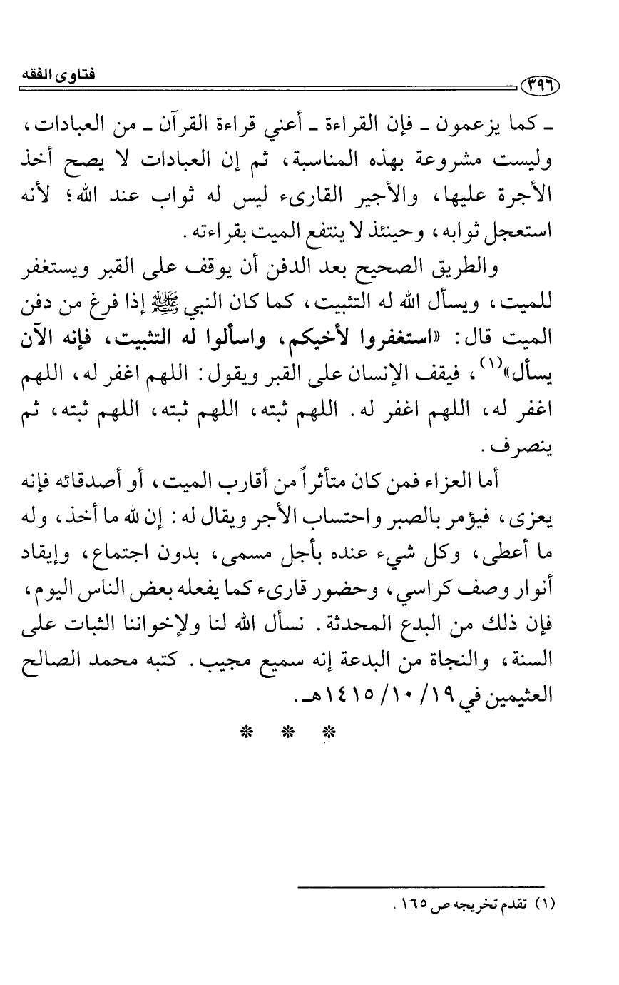 أما العزاء فمن كان متأثراً من أقارب الميت، أو أصدقائه فإنه يعزى، فيؤمر بالصبر واحتساب الأجر ويقال له: إن لله ما أخذ، وله ما أعطى، وكل شيء عنده بأجل مسمى، بدون اجتماع، وإيقاد أنوار وصف كراسي، وحضور قارىء كما يفعله بعض الناس اليوم، فإن ذلك من البدع المحدثة. نسأل الله لنا ولإخواننا الثبات على السنة، والنجاة من البدعة إنه سميع مجيب. كتبه محمد الصالح العثيمين في 19/01/1415 هـ.