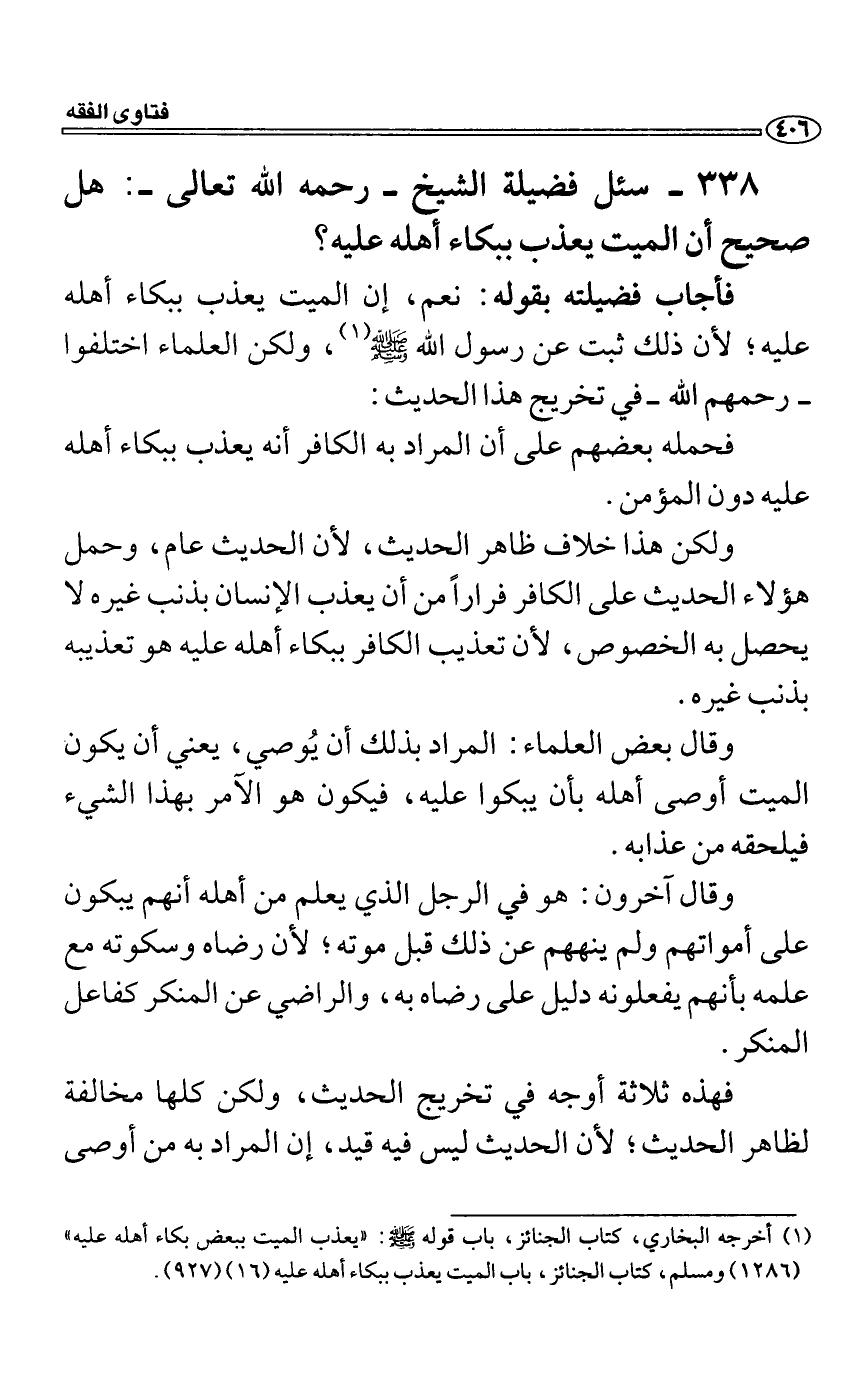 فأجاب فضيلته بقوله: نعم، إن الميت يعذب ببكاء أهله عليه؛ لأن ذلك ثبت عن رسول الله صَلَّى اللَّهُ عَلَيْهِ وَسَلَّمَ، ولكن العلماء اختلفوا رحمهم الله في تخريج هذا الحديث: