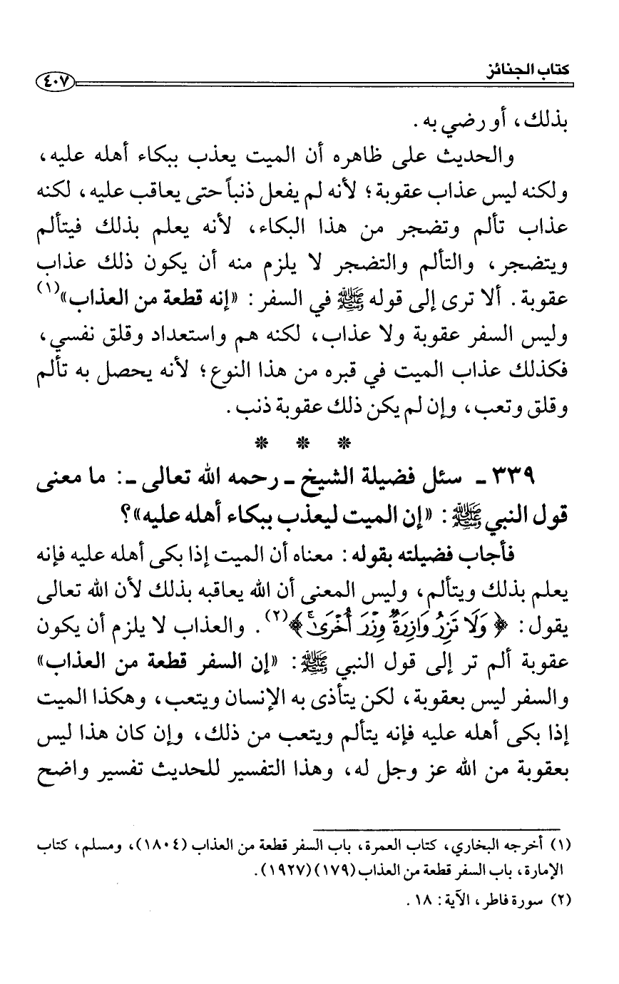 فأجاب فضيلته بقوله: معناه أن الميت إذا بكى أهله عليه فإنه يعلم بذلك ويتألم، وليس المعنى أن الله يعاقبه بذلك لأن الله تعالى يقول: {وَلاَ تَزِرُ وَازِرَةٌ وِزْرَ أُخْرَى وَإِن تَدْعُ مُثْقَلَةٌ إِلَى حِمْلِهَا لاَ يُحْمَلْ مِنْهُ شَىْءٌ وَلَوْ كَانَ ذَا قُرْبَى إِنَّمَا تُنذِرُ الَّذِينَ يَخْشَوْنَ رَبَّهُمْ بِالْغَيْبِ وَأَقَامُواْ الصلاةَ وَمَن تَزَكَّى فَإِنَّمَا يَتَزَكَّى لِنَفْسِهِ وَإِلَى اللهِ الْمَصِيرُ} . والعذاب لا يلزم أن يكون عقوبة ألم تر إلى قول النبي صَلَّى اللَّهُ عَلَيْهِ وَسَلَّمَ: "إن السفر قطعة من العذاب" والسفر ليس بعقوبة، لكن يتأذى به الإنسان ويتعب، وهكذا الميت إذا بكى أهله عليه فإنه يتألم ويتعب من ذلك، وإن كان هذا ليس بعقوبة من الله عز وجل له، وهذا التفسير للحديث تفسير واضح