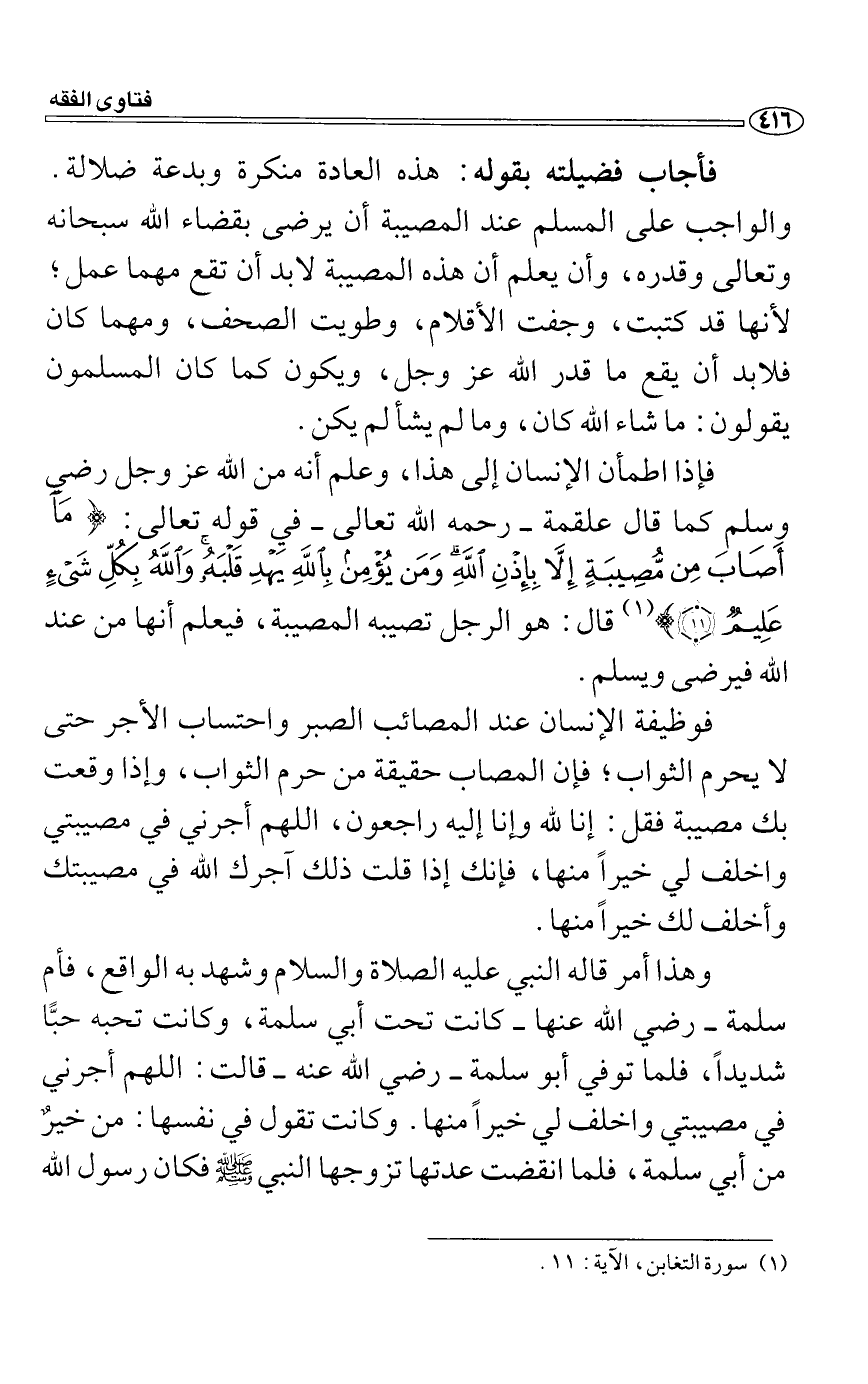 فإذا اطمأن الإنسان إلى هذا، وعلم أنه من الله عز وجل رضي وسلم كما قال علقمة رحمه الله تعالى في قوله تعالى: {مَآ أَصَابَ مِن مُّصِيبَةٍ إِلاَّ بِإِذْنِ اللهِ وَمَن يُؤْمِن بِاللهِ يَهْدِ قَلْبَهُ وَاللهُ بِكُلِّ شَىْءٍ عَلِيمٌ} قال: هو الرجل تصيبه المصيبة، فيعلم أنها من عند الله فيرضى ويسلم.