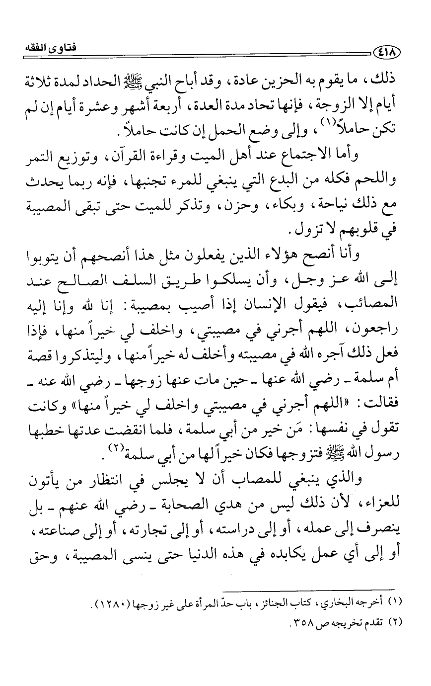 والذي ينبغي للمصاب أن لا يجلس في انتظار من يأتون للعزاء، لأن ذلك ليس من هدي الصحابة رضي الله عنهم بل ينصرف إلى عمله، أو إلى دراسته، أو إلى تجارته، أو إلى صناعته، أو إلى أي عمل يكابده في هذه الدنيا حتى ينسى المصيبة، وحق
