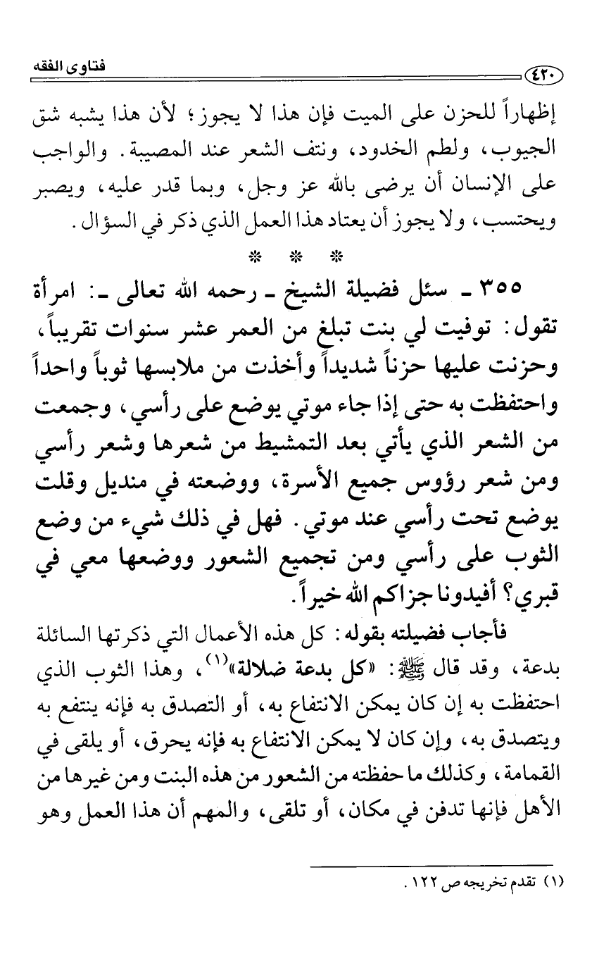 فأجاب فضيلته بقوله: كل هذه الأعمال التي ذكرتها السائلة بدعة، وقد قال صَلَّى اللَّهُ عَلَيْهِ وَسَلَّمَ: "كل بدعة ضلالة"، وهذا الثوب الذي احتفظت به إن كان يمكن الانتفاع به، أو التصدق به فإنه ينتفع به ويتصدق به، وإن كان لا يمكن الانتفاع به فإنه يحرق، أو يلقى في القمامة، وكذلك ما حفظته من الشعور من هذه البنت ومن غيرها من الأهل فإنها تدفن في مكان، أو تلقى، والمهم أن هذا العمل وهو