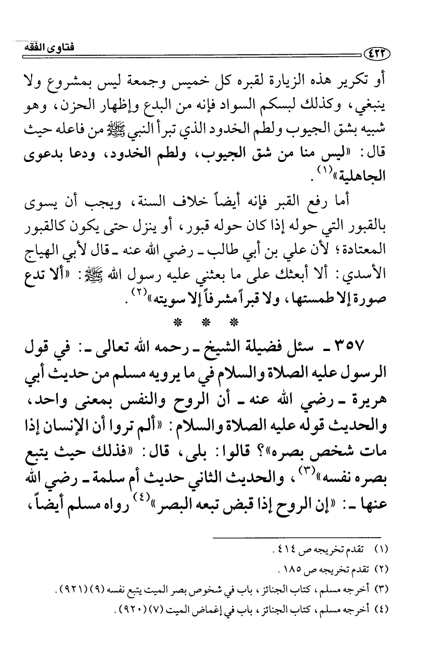 أو تكرير هذه الزيارة لقبره كل خميس وجمعة ليس بمشروع ولا ينبغي، وكذلك لبسكم السواد فإنه من البدع وإظهار الحزن، وهو شبيه بشق الجيوب ولطم الخدود الذي تبرأ النبي صَلَّى اللَّهُ عَلَيْهِ وَسَلَّمَ من فاعله حيث قال: "ليس منا من شق الجيوب، ولطم الخدود، ودعا بدعوى الجاهلية".