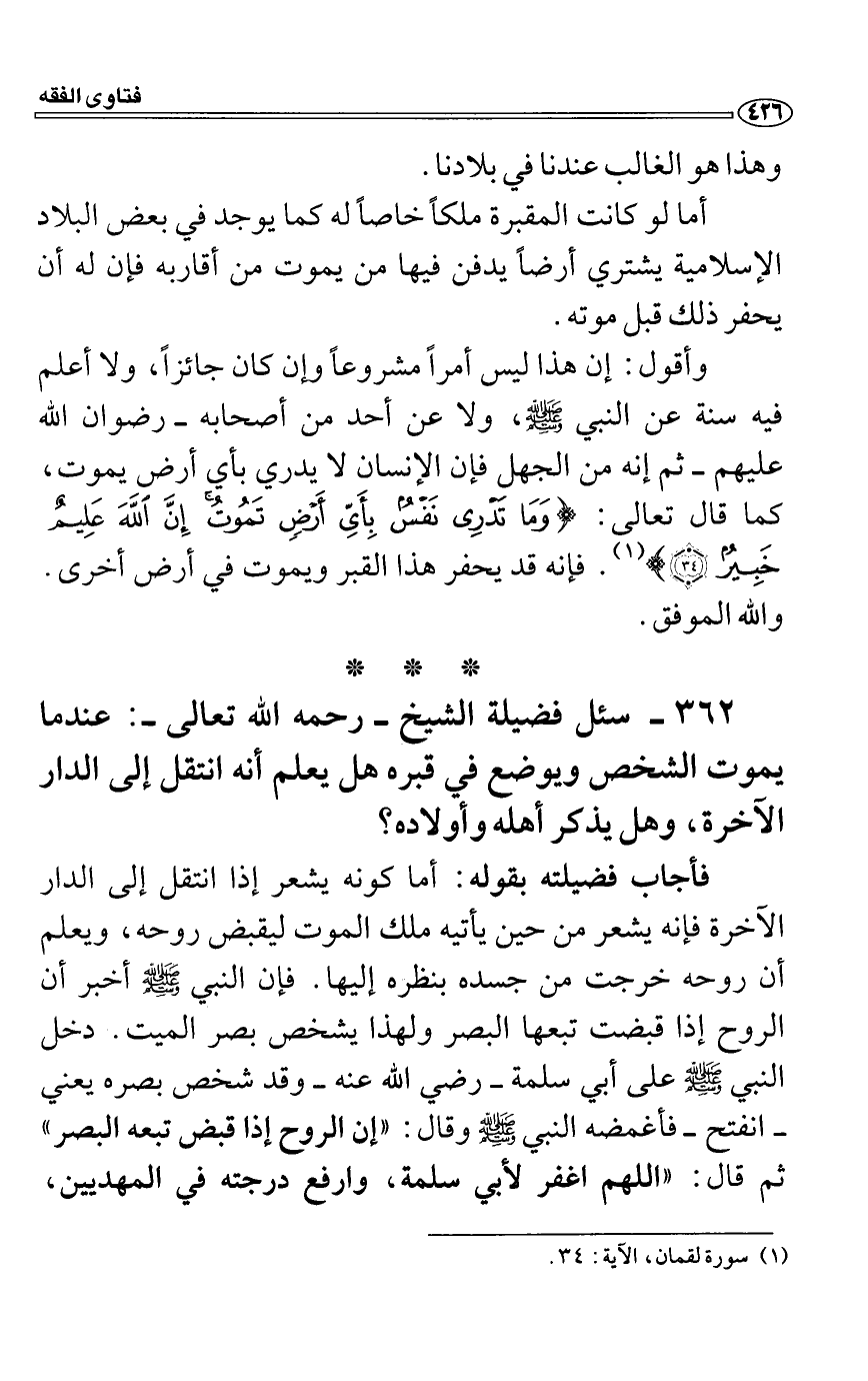 فأجاب فضيلته بقوله: أما كونه يشعر إذا انتقل إلى الدار الا?خرة فإنه يشعر من حين يأتيه ملك الموت ليقبض روحه، ويعلم أن روحه خرجت من جسده بنظره إليها. فإن النبي صَلَّى اللَّهُ عَلَيْهِ وَسَلَّمَ أخبر أن الروح إذا قبضت تبعها البصر ولهذا يشخص بصر الميت. دخل النبي صَلَّى اللَّهُ عَلَيْهِ وَسَلَّمَ على أبي سلمة رضي الله عنه وقد شخص بصره يعني انفتح فأغمضه النبي صَلَّى اللَّهُ عَلَيْهِ وَسَلَّمَ وقال: "إن الروح إذا قبض تبعه البصر" ثم قال: "اللهم اغفر لأبي سلمة، وارفع درجته في المهديين،