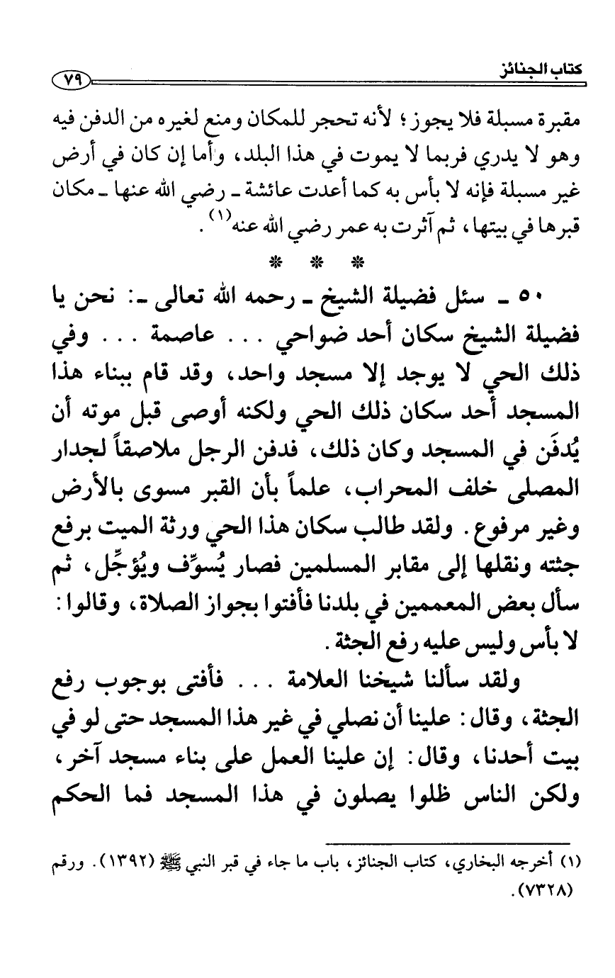 س 50 سئل فضيلة الشيخ رحمه الله تعالى: نحن يا فضيلة الشيخ سكان أحد ضواحي ... عاصمة ... وفي ذلك الحي لا يوجد إلا مسجد واحد، وقد قام ببناء هذا المسجد أحد سكان ذلك الحي ولكنه أوصى قبل موته أن يُدفَن في المسجد وكان ذلك، فدفن الرجل ملاصقاً لجدار المصلى خلف المحراب، علماً بأن القبر مسوى بالأرض وغير مرفوع. ولقد طالب سكان هذا الحي ورثة الميت برفع جثته ونقلها إلى مقابر المسلمين فصار يُسوِّف ويُؤجِّل، ثم سأل بعض المعممين في بلدنا فأفتوا بجواز الصلاة، وقالوا: لا بأس وليس عليه رفع الجثة.
