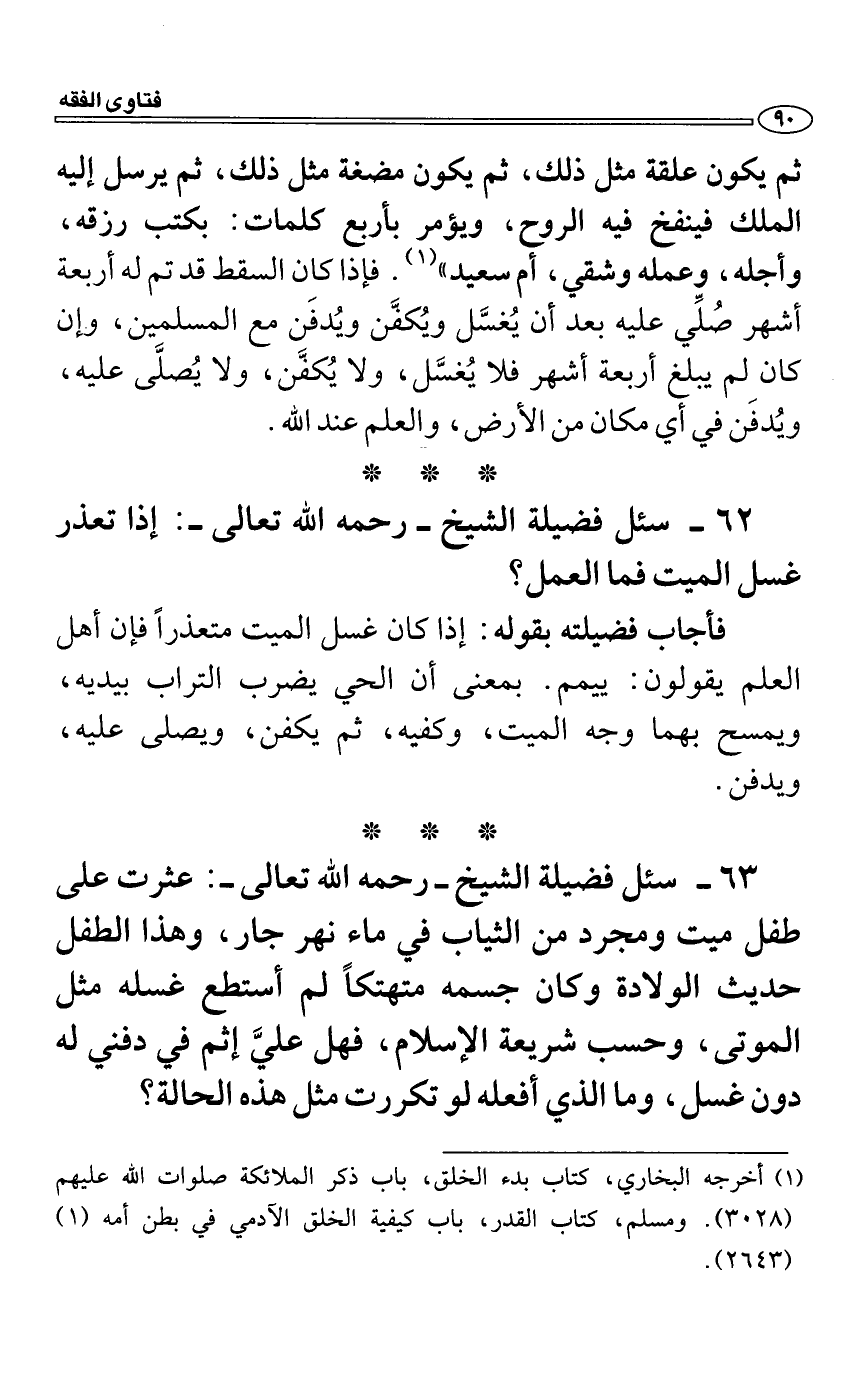ثم يكون علقة مثل ذلك، ثم يكون مضغة مثل ذلك، ثم يرسل إليه الملك فينفخ فيه الروح، ويؤمر بأربع كلمات: بكتب رزقه، وأجله، وعمله وشقي، أم سعيد» . فإذا كان السقط قد تم له أربعة أشهر صُلِّي عليه بعد أن يُغسَّل ويُكفَّن ويُدفَن مع المسلمين، وإن كان لم يبلغ أربعة أشهر فلا يُغسَّل، ولا يُكفَّن، ولا يُصلَّى عليه، ويُدفَن في أي مكان من الأرض، والعلم عند الله.