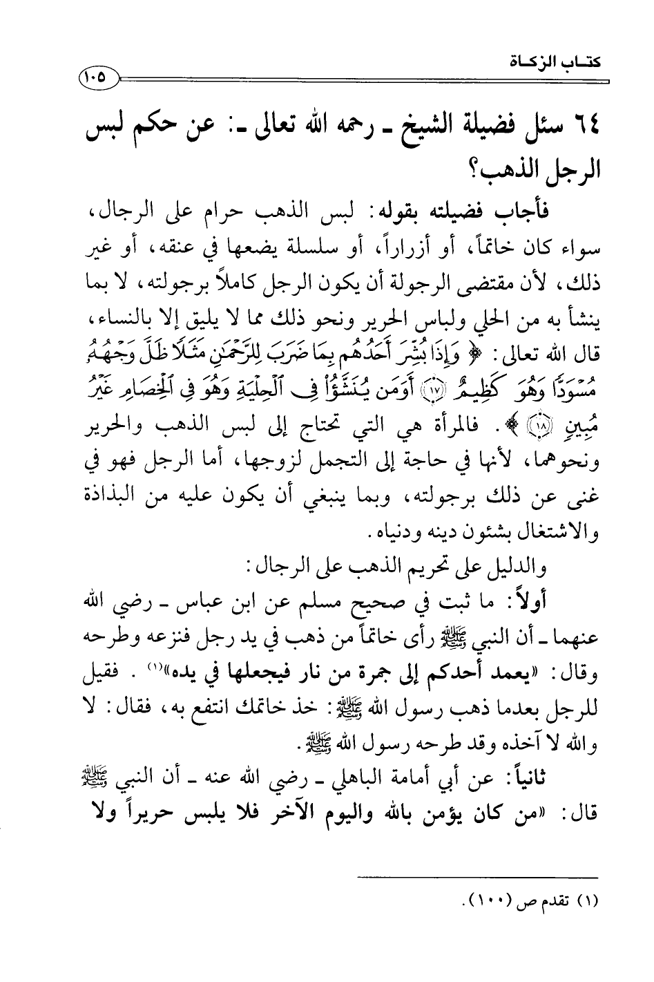 فأجاب فضيلته بقوله: لبس الذهب حرام على الرجال، سواء كان خاتماً، أو أزراراً، أو سلسلة يضعها في عنقه، أو غير ذلك، لأن مقتضى الرجولة أن يكون الرجل كاملاً برجولته، لا بما ينشأ به من الحلي ولباس الحرير ونحو ذلك مما لا يليق إلا بالنساء، قال الله تعالى: {وَإِذَا بُشِّرَ أَحَدُهُم بِمَا ضَرَبَ لِلرَّحْمَانِ مَثَلاً ظَلَّ وَجْهُهُ مُسْوَدّاً وَهُوَ كَظِيمٌ * أَوَمَن يُنَشَّأُ فِى الْحِلْيَةِ وَهُوَ فِى الْخِصَامِ غَيْرُ مُبِينٍ} . فالمرأة هي التي تحتاج إلى لبس الذهب والحرير ونحوهما، لأنها في حاجة إلى التجمل لزوجها، أما الرجل فهو في غنى عن ذلك برجولته، وبما ينبغي أن يكون عليه من البذاذة والاشتغال بشئون دينه ودنياه.