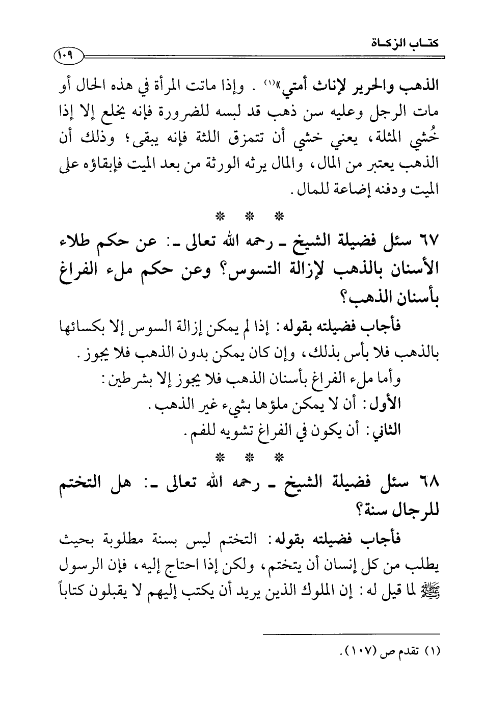 فأجاب فضيلته بقوله: إذا لم يمكن إزالة السوس إلا بكسائها بالذهب فلا بأس بذلك، وإن كان يمكن بدون الذهب فلا يجوز.