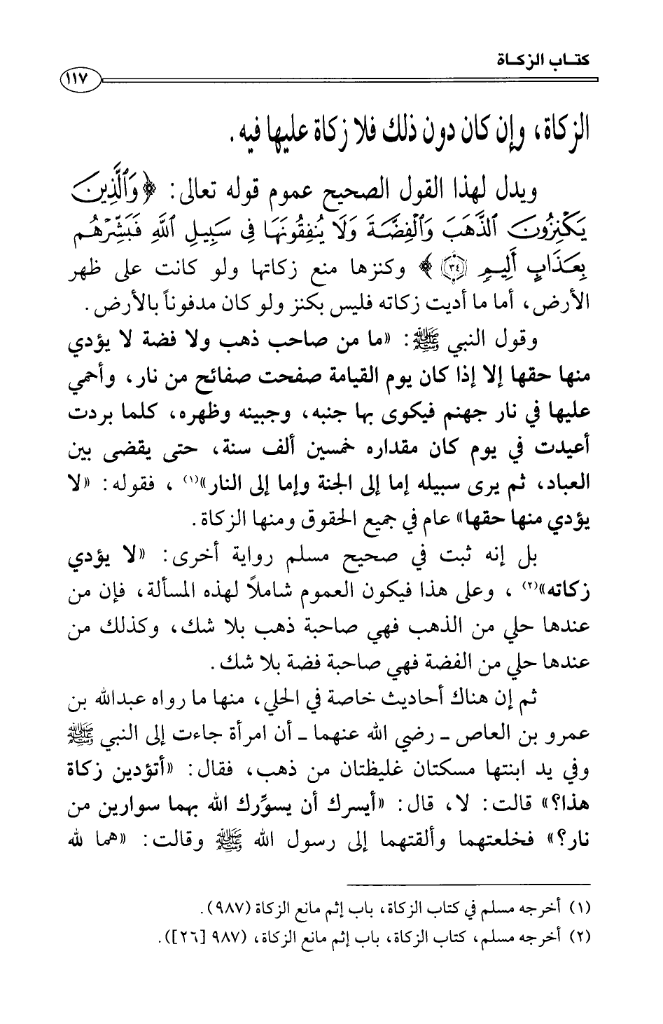 بل إنه ثبت في صحيح مسلم رواية أخرى: «لا يؤدي زكاته» ، وعلى هذا فيكون العموم شاملاً لهذه المسألة، فإن من عندها حلي من الذهب فهي صاحبة ذهب بلا شك، وكذلك من عندها حلي من الفضة فهي صاحبة فضة بلا شك.
