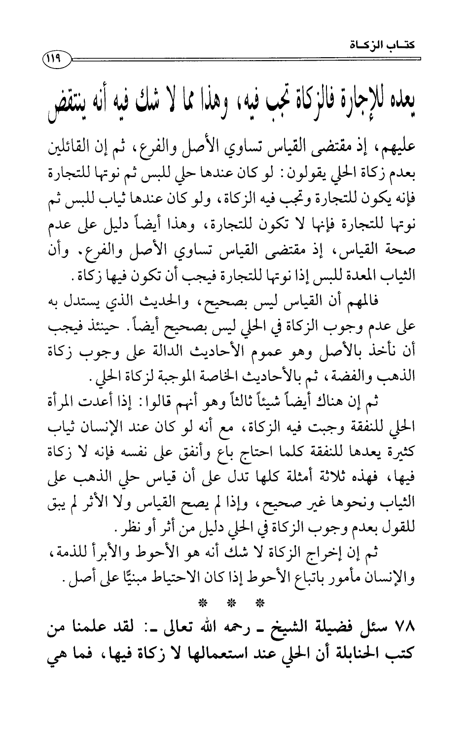 سئل فضيلة الشيخ - رحمه الله تعالى -: لقد علمنا من كتب الحنابلة أن الحلي عند استعمالها لا زكاة فيها، فما هي