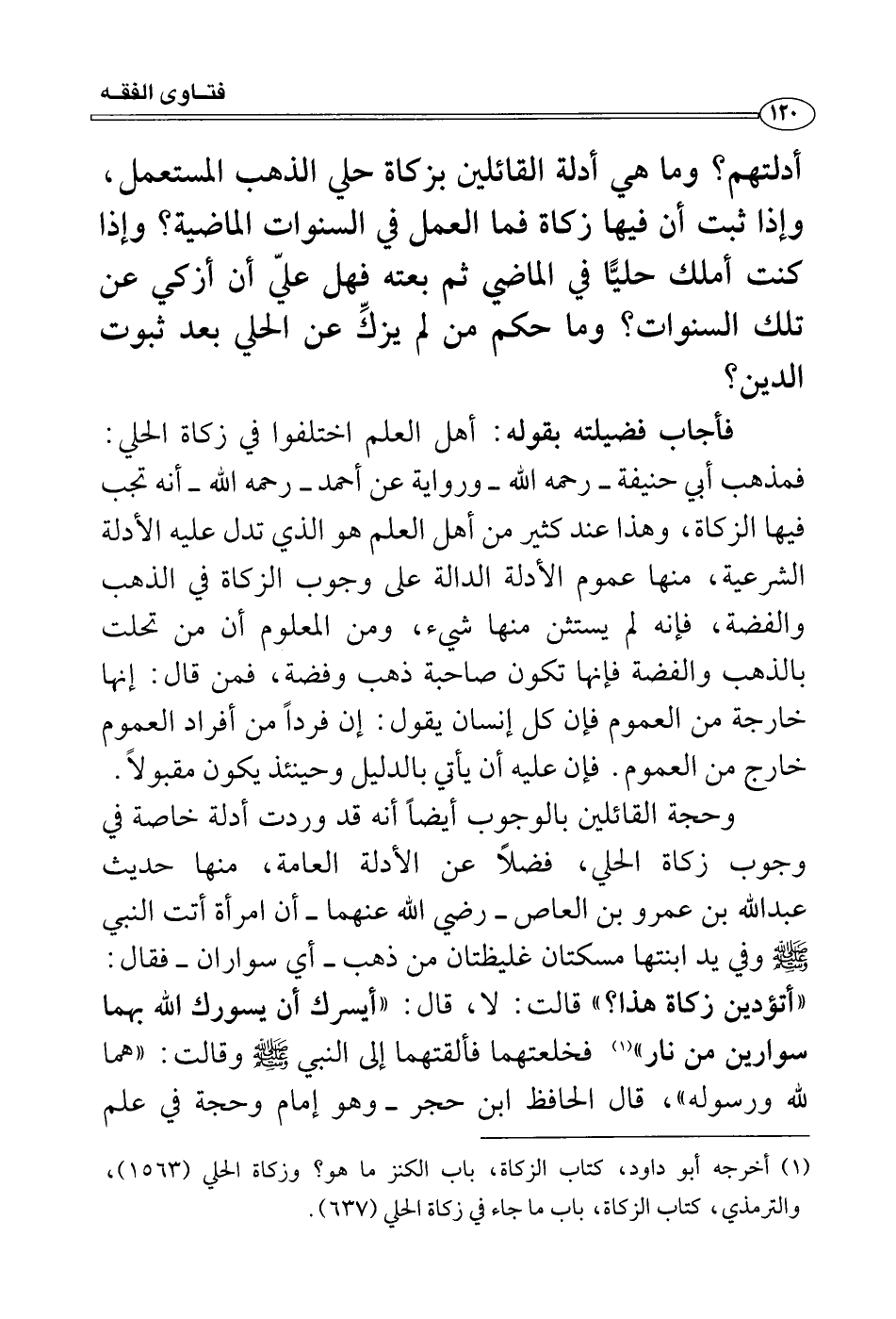 فأجاب فضيلته بقوله: أهل العلم اختلفوا في زكاة الحلي: فمذهب أبي حنيفة رحمه الله ورواية عن أحمد رحمه الله أنه تجب فيها الزكاة، وهذا عند كثير من أهل العلم هو الذي تدل عليه الأدلة الشرعية، منها عموم الأدلة الدالة على وجوب الزكاة في الذهب والفضة، فإنه لم يستثن منها شيء، ومن المعلوم أن من تحلت بالذهب والفضة فإنها تكون صاحبة ذهب وفضة، فمن قال: إنها خارجة من العموم فإن كل إنسان يقول: إن فرداً من أفراد العموم خارج من العموم. فإن عليه أن يأتي بالدليل وحينئذ يكون مقبولاً.