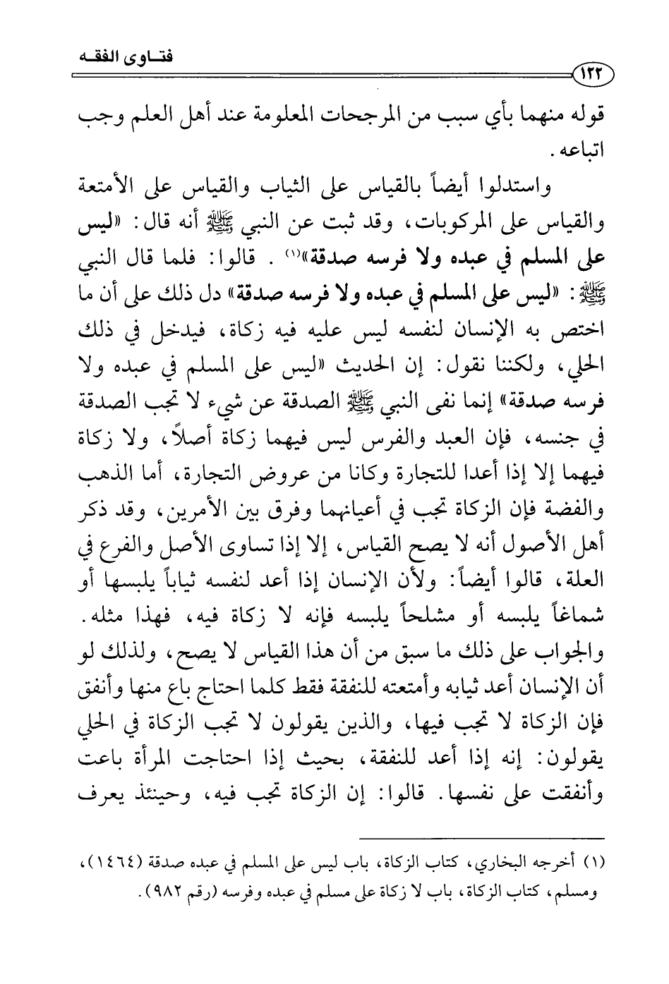 واستدلوا أيضاً بالقياس على الثياب والقياس على الأمتعة والقياس على المركوبات، وقد ثبت عن النبي صَلَّى اللَّهُ عَلَيْهِ وَسَلَّمَ أنه قال: «ليس على المسلم في عبده ولا فرسه صدقة» . قالوا: فلما قال النبي صَلَّى اللَّهُ عَلَيْهِ وَسَلَّمَ: «ليس على المسلم في عبده ولا فرسه صدقة» دل ذلك على أن ما اختص به الإنسان لنفسه ليس عليه فيه زكاة، فيدخل في ذلك الحلي، ولكننا نقول: إن الحديث «ليس على المسلم في عبده ولا فرسه صدقة» إنما نفى النبي صَلَّى اللَّهُ عَلَيْهِ وَسَلَّمَ الصدقة عن شيء لا تجب الصدقة في جنسه، فإن العبد والفرس ليس فيهما زكاة أصلاً، ولا زكاة فيهما إلا إذا أعدا للتجارة وكانا من عروض التجارة، أما الذهب والفضة فإن الزكاة تجب في أعيانهما وفرق بين الأمرين، وقد ذكر أهل الأصول أنه لا يصح القياس، إلا إذا تساوى الأصل والفرع في العلة، قالوا أيضاً: ولأن الإنسان إذا أعد لنفسه ثياباً يلبسها أو شماغاً يلبسه أو مشلحاً يلبسه فإنه لا زكاة فيه، فهذا مثله. والجواب على ذلك ما سبق من أن هذا القياس لا يصح، ولذلك لو أن الإنسان أعد ثيابه وأمتعته للنفقة فقط كلما احتاج باع منها وأنفق فإن الزكاة لا تجب فيها، والذين يقولون لا تجب الزكاة في الحلي يقولون: إنه إذا أعد للنفقة، بحيث إذا احتاجت المرأة باعت وأنفقت على نفسها. قالوا: إن الزكاة تجب فيه، وحينئذ يعرف