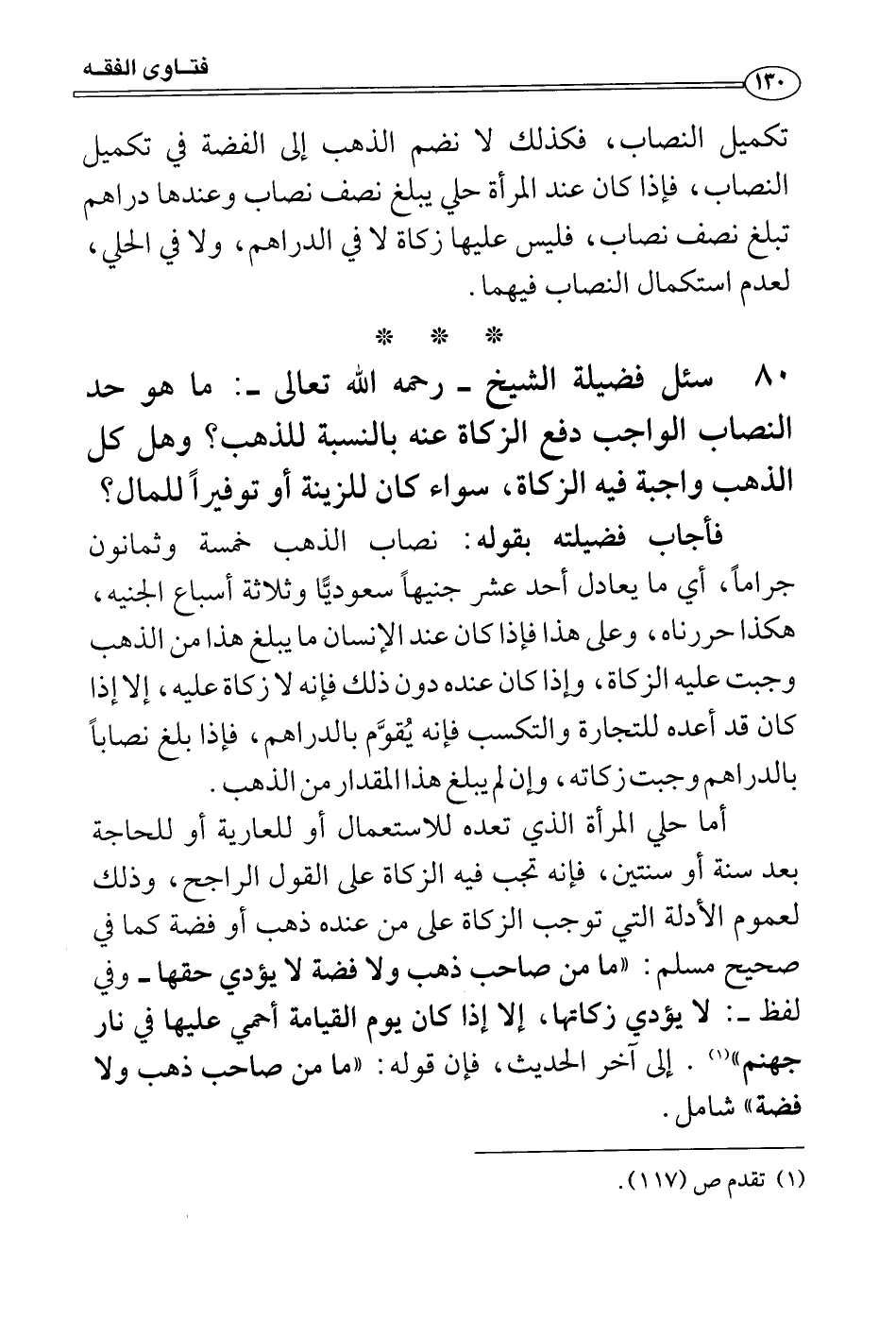 فأجاب فضيلته بقوله: نصاب الذهب خمسة وثمانون جراماً، أي ما يعادل أحد عشر جنيهاً سعوديًّا وثلاثة أسباع الجنيه، هكذا حررناه، وعلى هذا فإذا كان عند الإنسان ما يبلغ هذا من الذهب وجبت عليه الزكاة، وإذا كان عنده دون ذلك فإنه لا زكاة عليه، إلا إذا كان قد أعده للتجارة والتكسب فإنه يُقوَّم بالدراهم، فإذا بلغ نصاباً بالدراهم وجبت زكاته، وإن لم يبلغ هذا المقدار من الذهب.