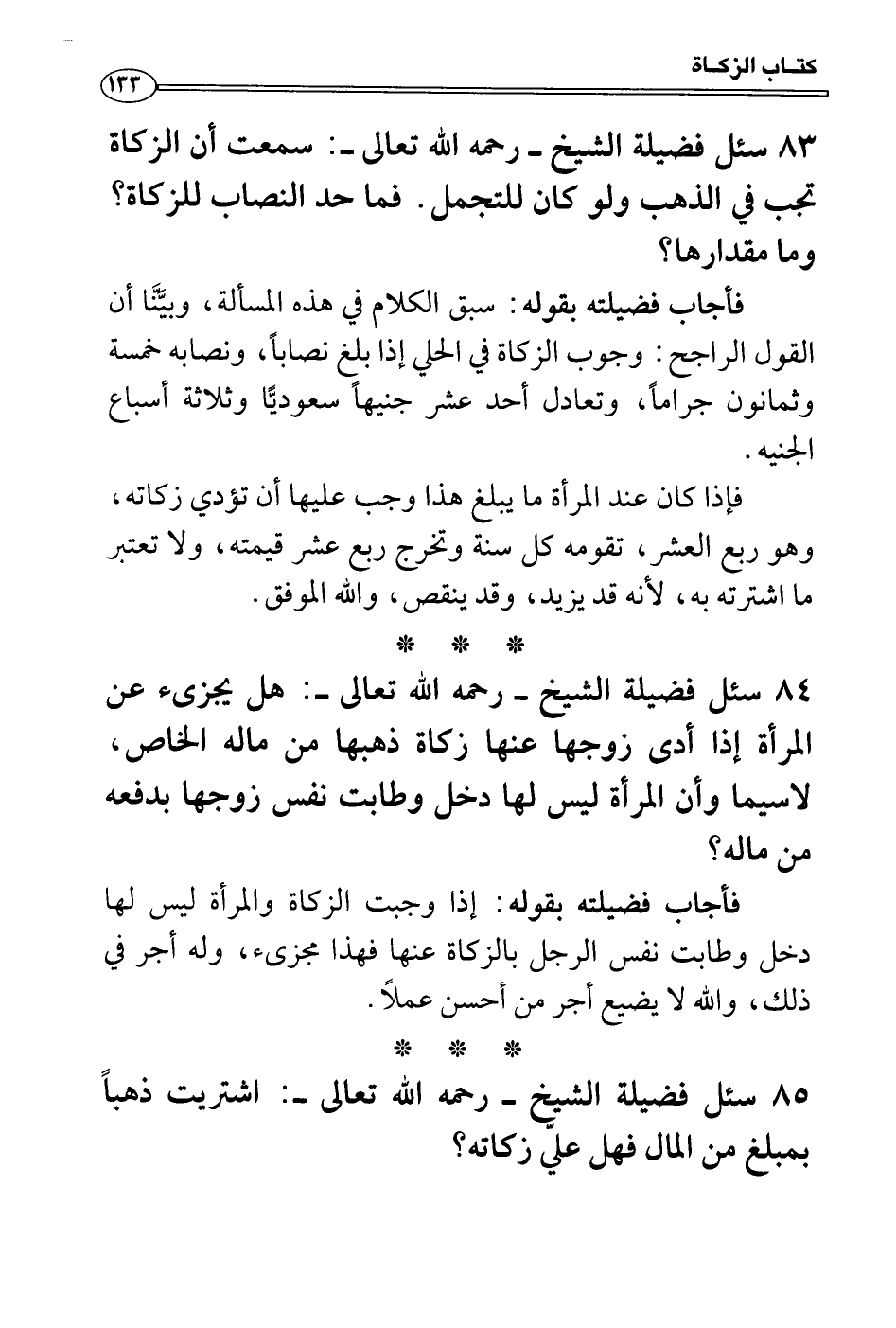 فأجاب فضيلته بقوله: سبق الكلام في هذه المسألة، وبيَّنَّا أن القول الراجح: وجوب الزكاة في الحلي إذا بلغ نصاباً، ونصابه خمسة وثمانون جراماً، وتعادل أحد عشر جنيهاً سعوديًّا وثلاثة أسباع الجنيه.