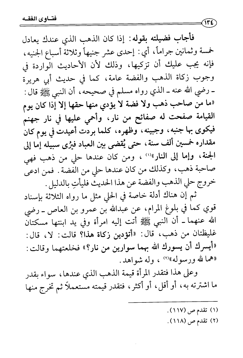 فأجاب فضيلته بقوله: إذا كان الذهب الذي عندك يعادل خمسة وثمانين جراماً، أي: إحدى عشر جنيهاً وثلاثة أسباع الجنيه، فإنه يجب عليك أن تزكيها، وذلك لأن الأحاديث الواردة في وجوب زكاة الذهب والفضة عامة، كما في حديث أبي هريرة رضي الله عنه الذي رواه مسلم في صحيحه، أن النبي صَلَّى اللَّهُ عَلَيْهِ وَسَلَّمَ قال: «ما من صاحب ذهب ولا فضة لا يؤدي منها حقها إلا إذا كان يوم القيامة صفحت له صفائح من نار، وأحمي عليها في نار جهنم فيكوى بها جنبه، وجبينه، وظهره، كلما بردت أعيدت في يوم كان مقداره خمسين ألف سنة، حتى يُقضى بين العباد فيُرى سبيله إما إلى الجنة، وإما إلى النار» ، ومن كان عندها حلي من ذهب فهي صاحبة ذهب، وكذلك من كان عندها حلي من الفضة. فمن ادعى خروج حلي الذهب والفضة عن هذا الحديث فليأتِ بالدليل.