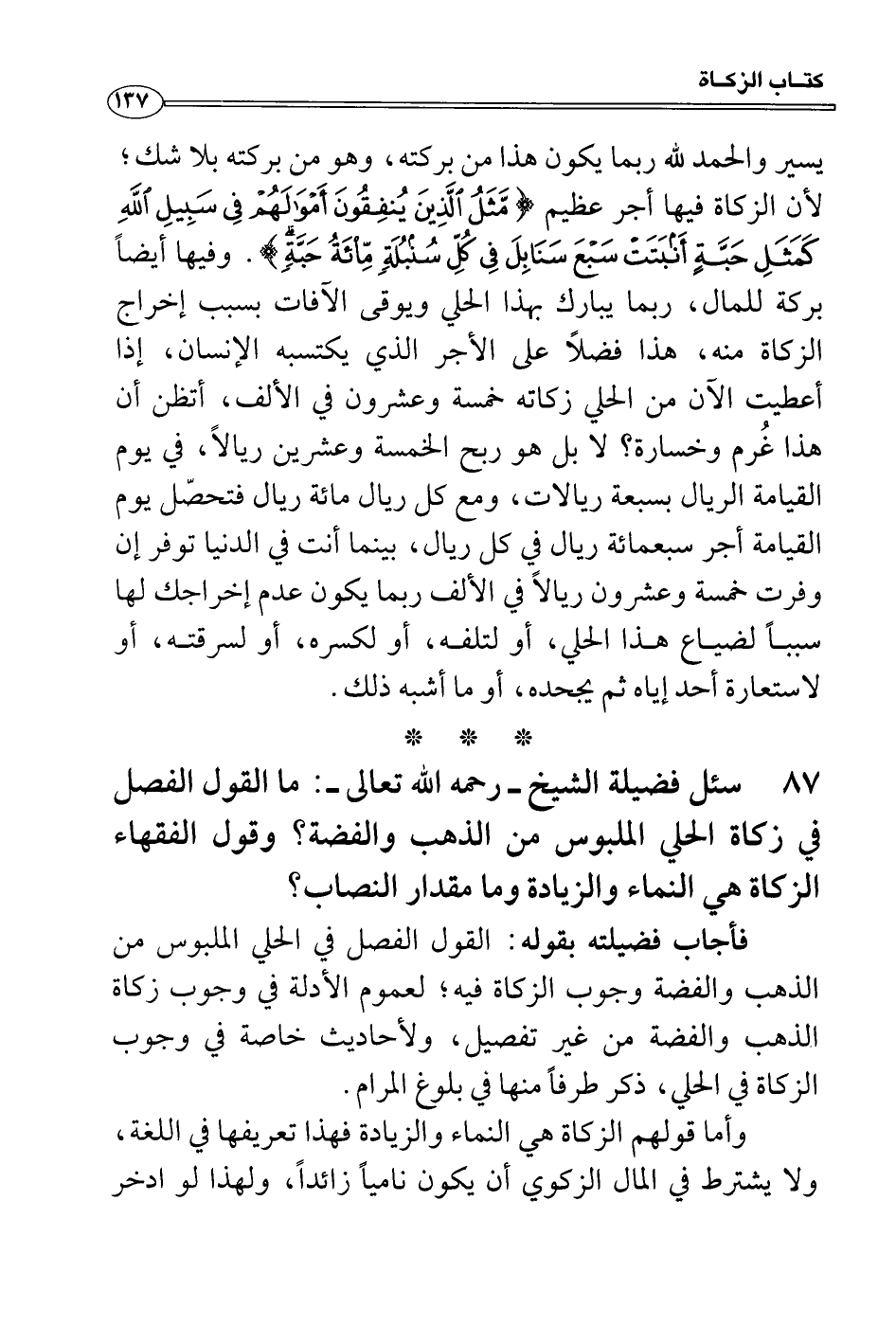 يسير والحمد لله ربما يكون هذا من بركته، وهو من بركته بلا شك؛ لأن الزكاة فيها أجر عظيم {مَّثَلُ الَّذِينَ يُنفِقُونَ أَمْوَالَهُمْ فِي سَبِيلِ اللهِ كَمَثَلِ حَبَّةٍ أَنبَتَتْ سَبْعَ سَنَابِلَ فِي كُلِّ سُنبُلَةٍ مِّاْئَةُ حَبَّةٍ وَاللهُ يُضَاعِفُ لِمَن يَشَآءُ وَاللهُ وَاسِعٌ عَلِيمٌ} . وفيها أيضاً بركة للمال، ربما يبارك بهذا الحلي ويوقى الا"فات بسبب إخراج الزكاة منه، هذا فضلاً على الأجر الذي يكتسبه الإنسان، إذا أعطيت الآن من الحلي زكاته خمسة وعشرون في الألف، أتظن أن هذا غُرم وخسارة؟ لا بل هو ربح الخمسة وعشرين ريالاً، في يوم القيامة الريال بسبعة ريالات، ومع كل ريال مائة ريال فتحصّل يوم القيامة أجر سبعمائة ريال في كل ريال، بينما أنت في الدنيا توفر إن وفرت خمسة وعشرون ريالاً في الألف ربما يكون عدم إخراجك لها سبباً لضياع هذا الحلي، أو لتلفه، أو لكسره، أو لسرقته، أو لاستعارة أحد إياه ثم يجحده، أو ما أشبه ذلك.