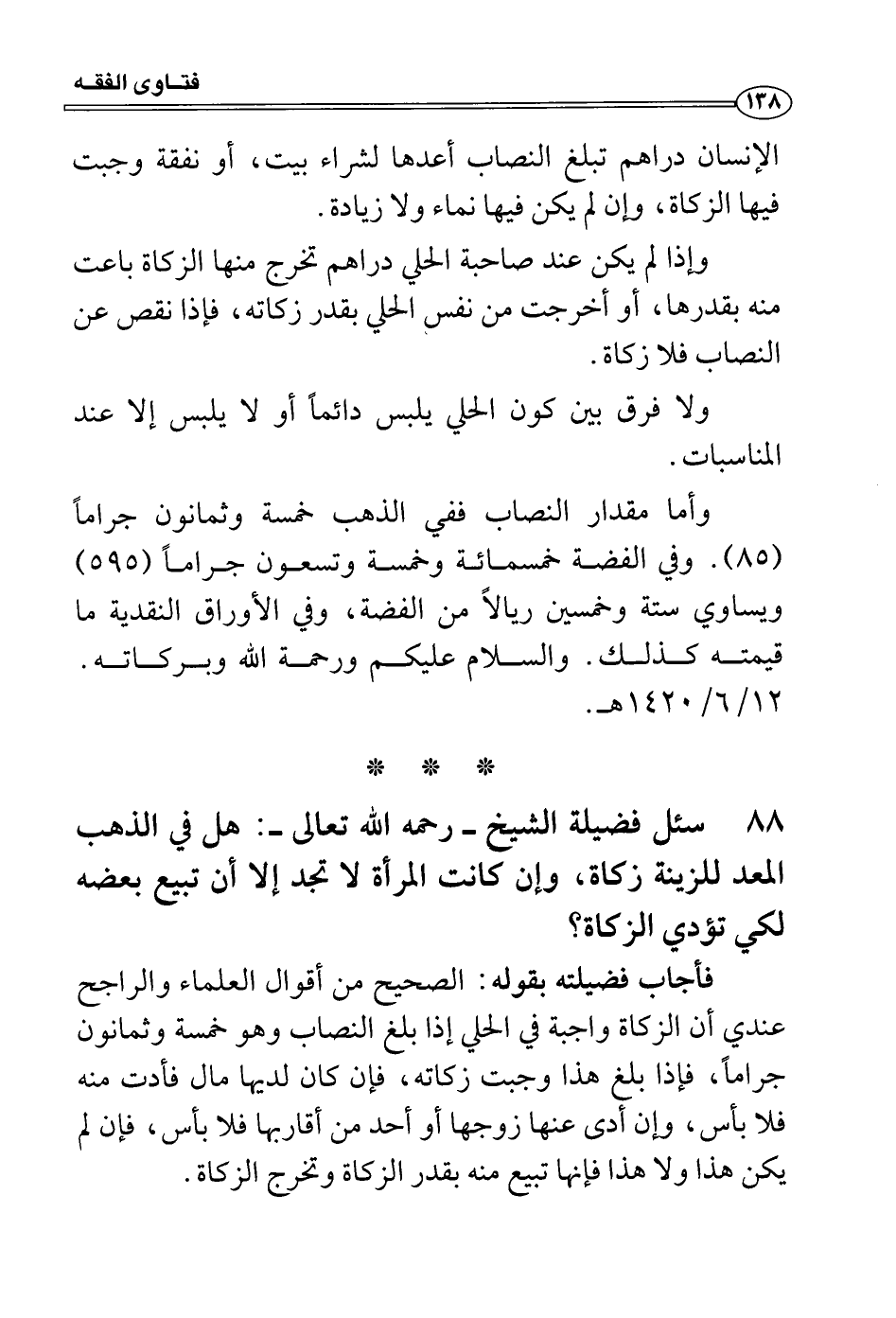 وأما مقدار النصاب ففي الذهب خمسة وثمانون جراماً (58) . وفي الفضة خمسمائة وخمسة وتسعون جراماً (595) ويساوي ستة وخمسين ريالاً من الفضة، وفي الأوراق النقدية ما قيمته كذلك. والسلام عليكم ورحمة الله وبركاته. 12/6/1420 هـ.