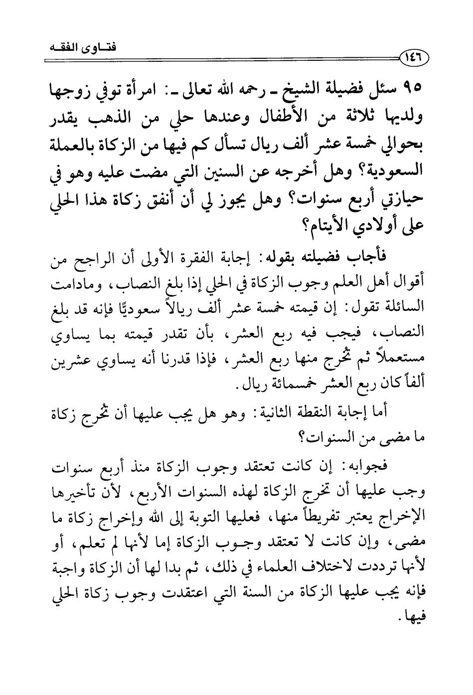 فأجاب فضيلته بقوله: إجابة الفقرة الأولى أن الراجح من أقوال أهل العلم وجوب الزكاة في الحلي إذا بلغ النصاب، ومادامت السائلة تقول: إن قيمته خمسة عشر ألف ريالاً سعوديًّا فإنه قد بلغ النصاب، فيجب فيه ربع العشر، بأن تقدر قيمته بما يساوي مستعملاً ثم تُخرج منها ربع العشر، فإذا قدرنا أنه يساوي عشرين ألفاً كان ربع العشر خمسمائة ريال.