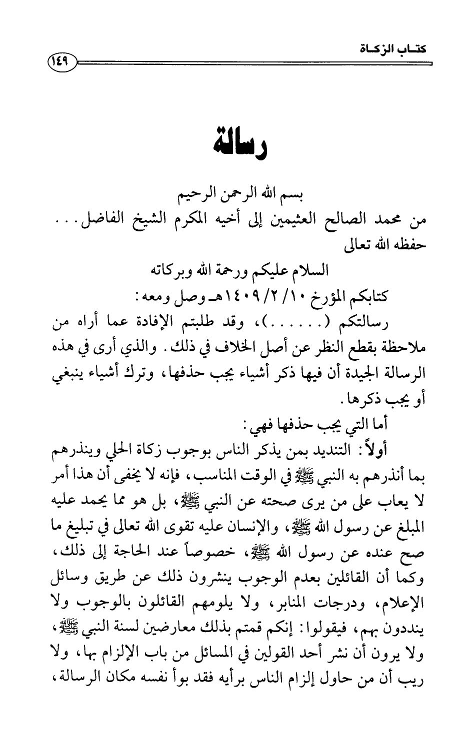 من محمد الصالح العثيمين إلى أخيه المكرم الشيخ الفاضل ... حفظه الله تعالى