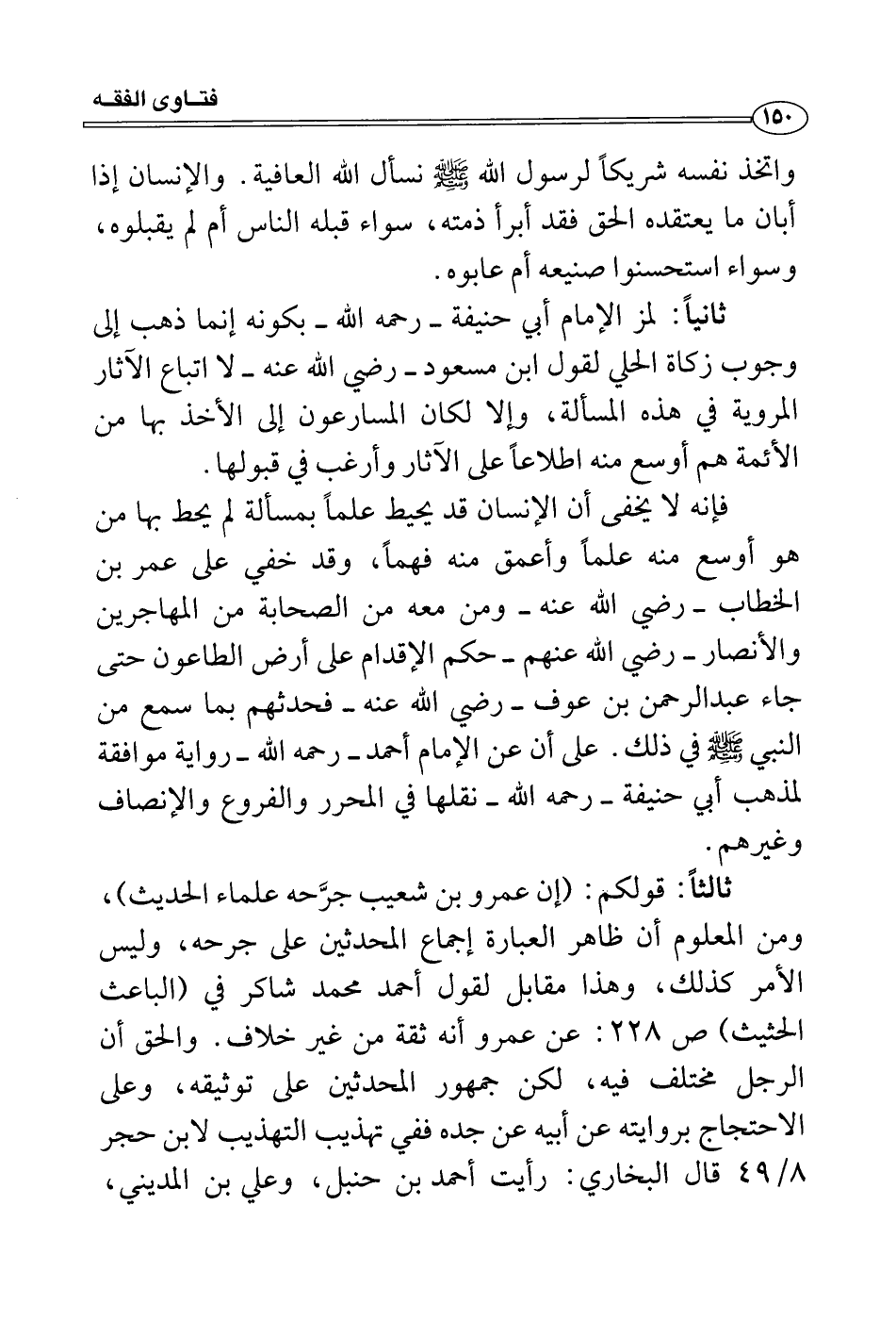 ثانياً: لمز الإمام أبي حنيفة رحمه الله بكونه إنما ذهب إلى وجوب زكاة الحلي لقول ابن مسعود رضي الله عنه لا اتباع الا"ثار المروية في هذه المسألة، وإلا لكان المسارعون إلى الأخذ بها من الأئمة هم أوسع منه اطلاعاً على الا"ثار وأرغب في قبولها.