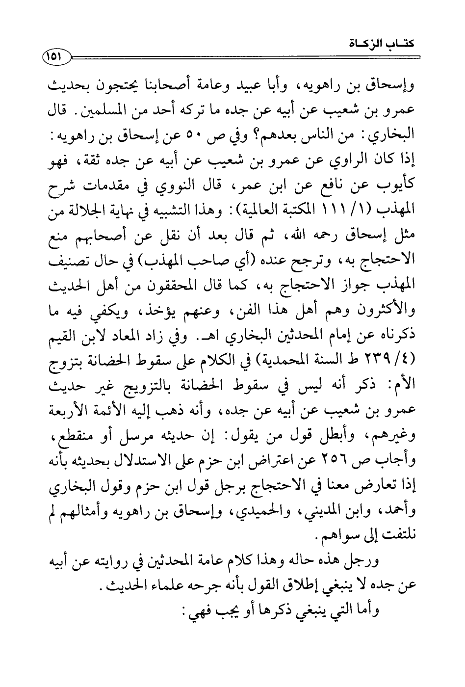 وإسحاق بن راهويه، وأبا عبيد وعامة أصحابنا يحتجون بحديث عمرو بن شعيب عن أبيه عن جده ما تركه أحد من المسلمين. قال البخاري: من الناس بعدهم؟ وفي ص 05 عن إسحاق بن راهويه: إذا كان الراوي عن عمرو بن شعيب عن أبيه عن جده ثقة، فهو كأيوب عن نافع عن ابن عمر، قال النووي في مقدمات شرح المهذب (1/111 المكتبة العالمية) : وهذا التشبيه في نهاية الجلالة من مثل إسحاق رحمه الله، ثم قال بعد أن نقل عن أصحابهم منع الاحتجاج به، وترجح عنده (أي صاحب المهذب) في حال تصنيف المهذب جواز الاحتجاج به، كما قال المحققون من أهل الحديث والأكثرون وهم أهل هذا الفن، وعنهم يؤخذ، ويكفي فيه ما ذكرناه عن إمام المحدثين البخاري اه. وفي زاد المعاد لابن القيم (4/932 ط السنة المحمدية) في الكلام على سقوط الحضانة بتزوج الأم: ذكر أنه ليس في سقوط الحضانة بالتزويج غير حديث عمرو بن شعيب عن أبيه عن جده، وأنه ذهب إليه الأئمة الأربعة وغيرهم، وأبطل قول من يقول: إن حديثه مرسل أو منقطع، وأجاب ص 652 عن اعتراض ابن حزم على الاستدلال بحديثه بأنه إذا تعارض معنا في الاحتجاج برجل قول ابن حزم وقول البخاري وأحمد، وابن المديني، والحميدي، وإسحاق بن راهويه وأمثالهم لم نلتفت إلى سواهم.