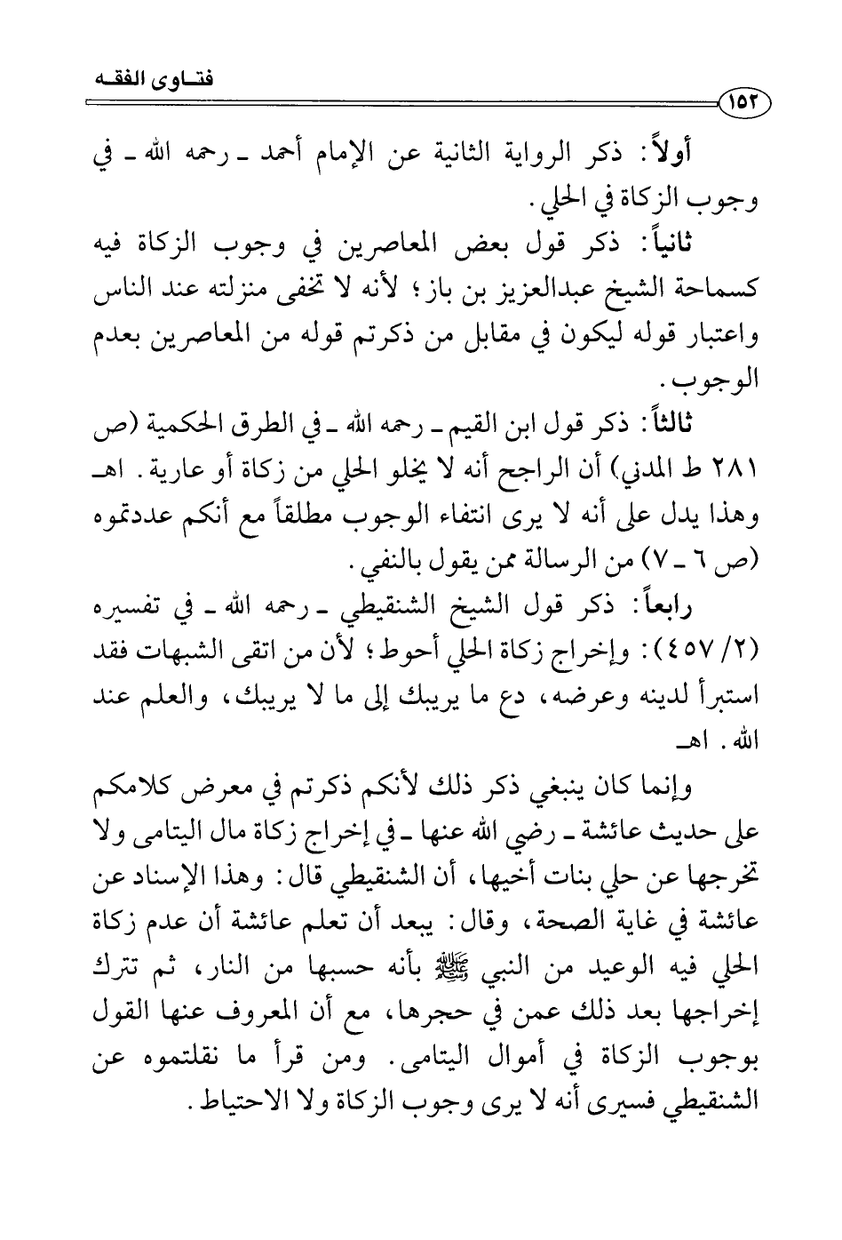 ثالثاً: ذكر قول ابن القيم رحمه الله في الطرق الحكمية (ص 182 ط المدني) أن الراجح أنه لا يخلو الحلي من زكاة أو عارية. اه وهذا يدل على أنه لا يرى انتفاء الوجوب مطلقاً مع أنكم عددتموه (ص 6 7) من الرسالة ممن يقول بالنفي.