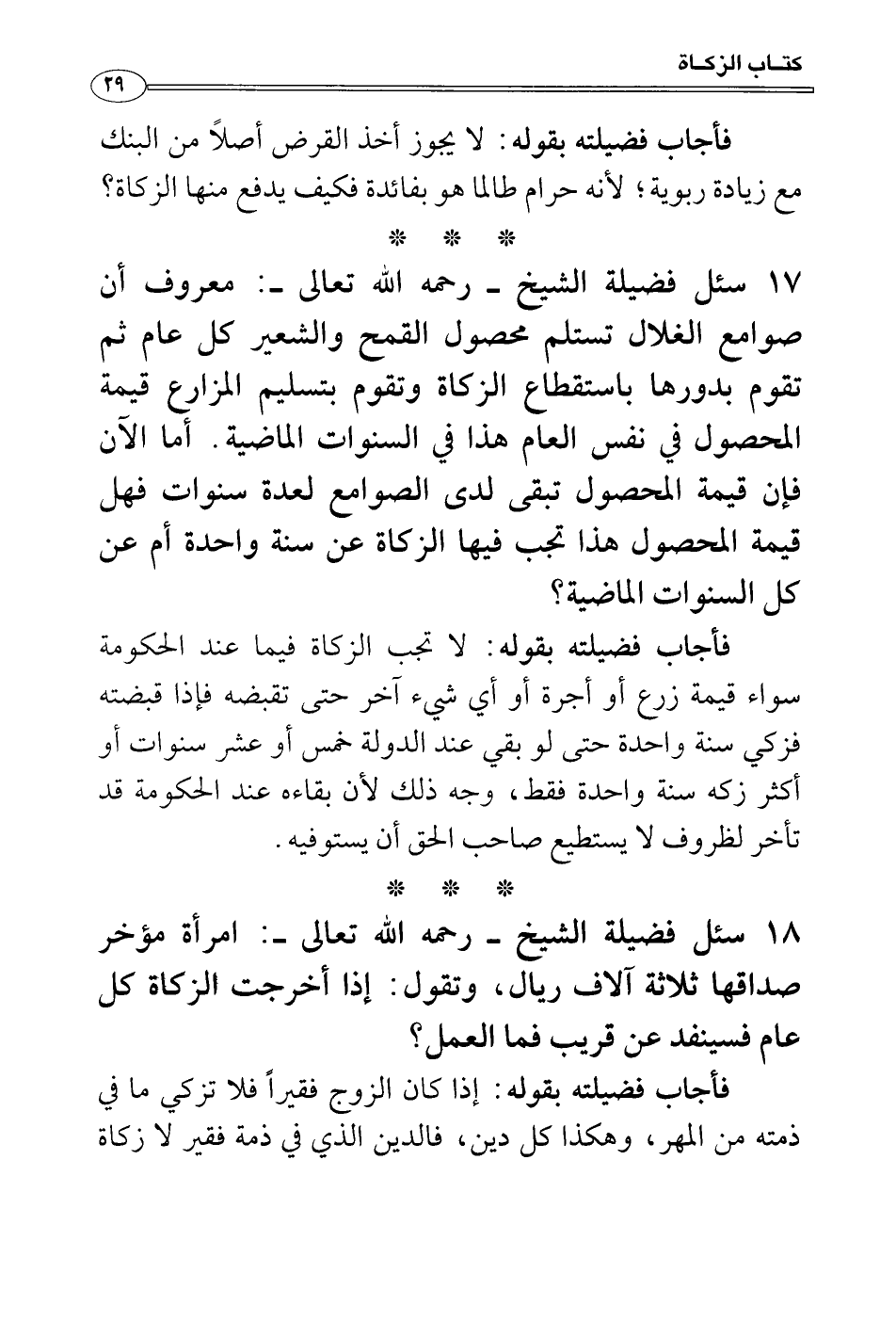 سئل فضيلة الشيخ - رحمه الله تعالى -: معروف أن صوامع الغلال تستلم محصول القمح والشعير كل عام ثم تقوم بدورها باستقطاع الزكاة وتقوم بتسليم المزارع قيمة المحصول في نفس العام هذا في السنوات الماضية. أما الآن فإن قيمة المحصول تبقى لدى الصوامع لعدة سنوات فهل قيمة المحصول هذا تجب فيها الزكاة عن سنة واحدة أم عن كل السنوات الماضية؟