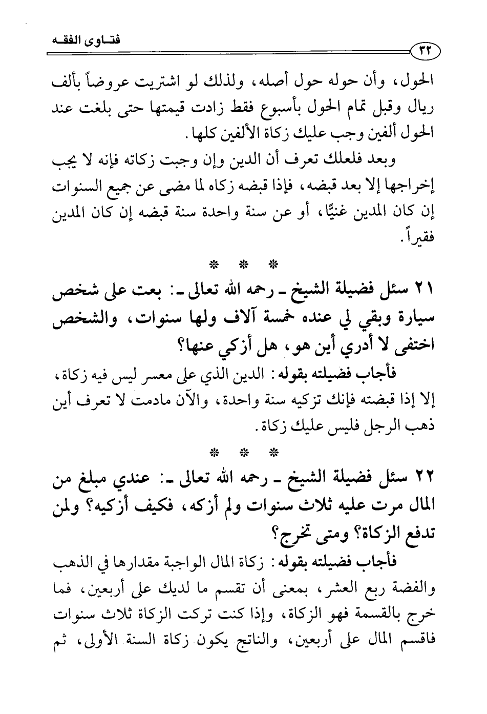 فأجاب فضيلته بقوله: زكاة المال الواجبة مقدارها في الذهب والفضة ربع العشر، بمعنى أن تقسم ما لديك على أربعين، فما خرج بالقسمة فهو الزكاة، وإذا كنت تركت الزكاة ثلاث سنوات فاقسم المال على أربعين، والناتج يكون زكاة السنة الأولى، ثم