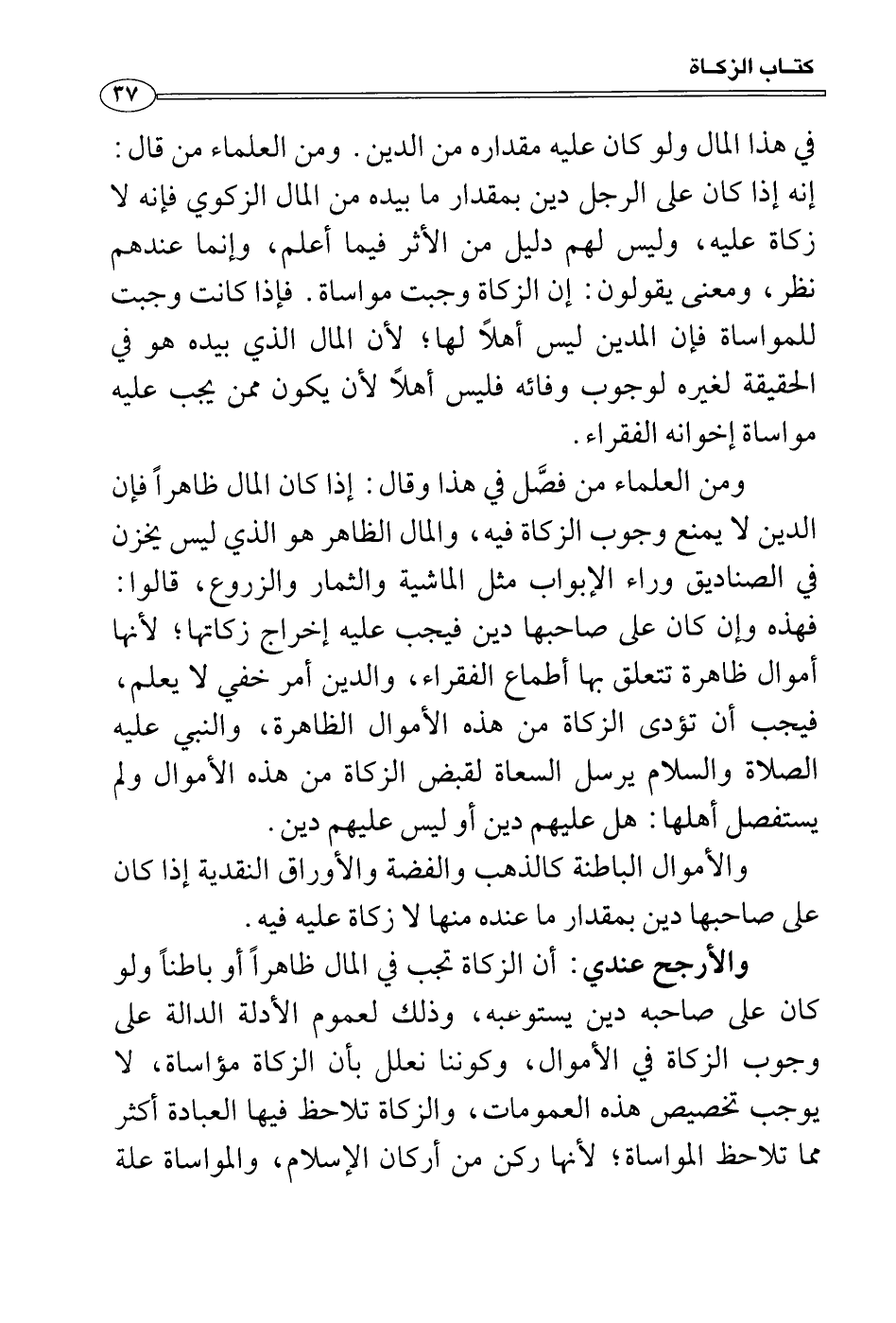 في هذا المال ولو كان عليه مقداره من الدين. ومن العلماء من قال: إنه إذا كان على الرجل دين بمقدار ما بيده من المال الزكوي فإنه لا زكاة عليه، وليس لهم دليل من الأثر فيما أعلم، وإنما عندهم نظر، ومعنى يقولون: إن الزكاة وجبت مواساة. فإذا كانت وجبت للمواساة فإن المدين ليس أهلاً لها؛ لأن المال الذي بيده هو في الحقيقة لغيره لوجوب وفائه فليس أهلاً لأن يكون ممن يجب عليه مواساة إخوانه الفقراء.