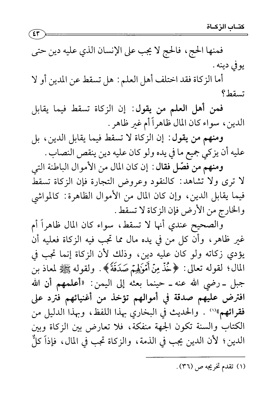 والصحيح عندي أنها لا تسقط، سواء كان المال ظاهراً أم غير ظاهر، وأن كل من في يده مال مما تجب فيه الزكاة فعليه أن يؤدي زكاته ولو كان عليه دين، وذلك لأن الزكاة إنما تجب في المال؛ لقوله تعالى: {خُذْ مِنْ أَمْوَالِهِمْ صَدَقَةً تُطَهِّرُهُمْ وَتُزَكِّيهِمْ بِهَا وَصَلِّ عَلَيْهِمْ إِنَّ صلاتَكَ سَكَنٌ لَّهُمْ وَاللهُ سَمِيعٌ عَلِيمٌ} . ولقوله صَلَّى اللَّهُ عَلَيْهِ وَسَلَّمَ لمعاذ بن جبل رضي الله عنه حينما بعثه إلى اليمن: «أعلمهم أن الله افترض عليهم صدقة في أموالهم تؤخذ من أغنيائهم فترد على فقرائهم» . والحديث في البخاري بهذا اللفظ، وبهذا الدليل من الكتاب والسنة تكون الجهة منفكة، فلا تعارض بين الزكاة وبين الدين؛ لأن الدين يجب في الذمة، والزكاة تجب في المال، فإذاً كلٌّ