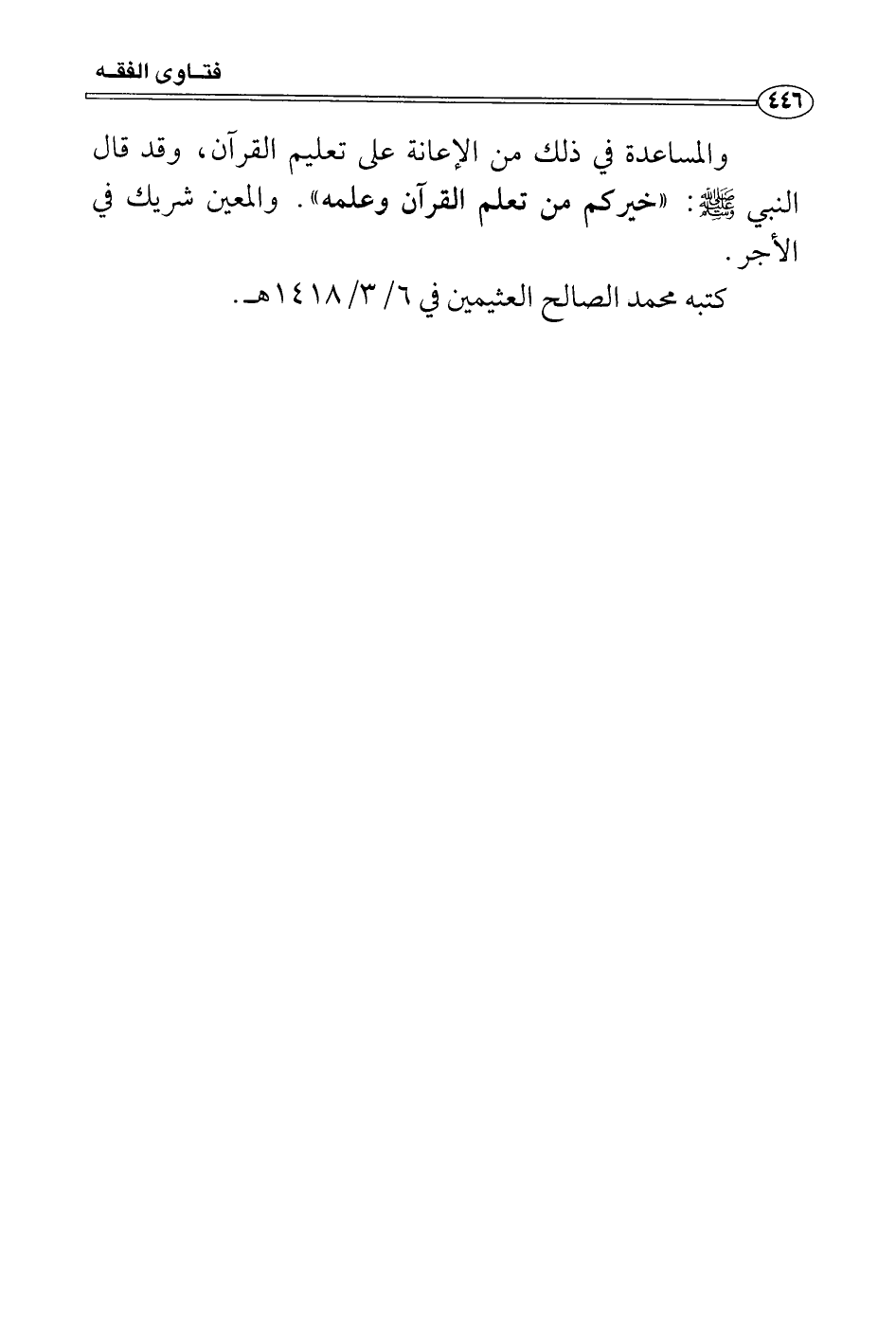 والمساعدة في ذلك من الإعانة على تعليم القرآن، وقد قال النبي صَلَّى اللَّهُ عَلَيْهِ وَسَلَّمَ: «خيركم من تعلم القرآن وعلمه» . والمعين شريك في الأجر.