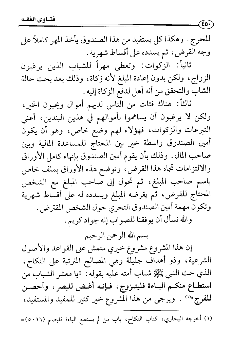 إن هذا المشروع مشروع خيري متمش على القواعد والأصول الشرعية، وذو أهداف جليلة وهي المصالح المترتبة على النكاح، الذي حث النبي صَلَّى اللَّهُ عَلَيْهِ وَسَلَّمَ شباب أمته عليه بقوله: «يا معشر الشباب من استطاع منكم الباءة فليتزوج، فإنه أغض للبصر، وأحصن للفرج» . ويرجى من هذا المشروع خير كثير للمفيد والمستفيد،