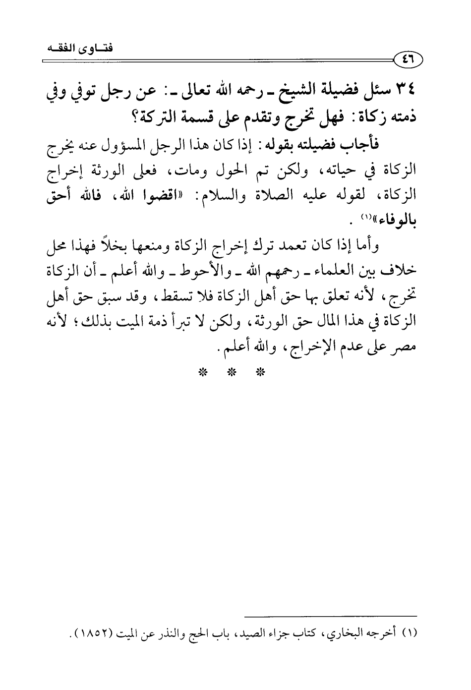 سئل فضيلة الشيخ - رحمه الله تعالى -: عن رجل توفي وفي ذمته زكاة: فهل تخرج وتقدم على قسمة التركة؟