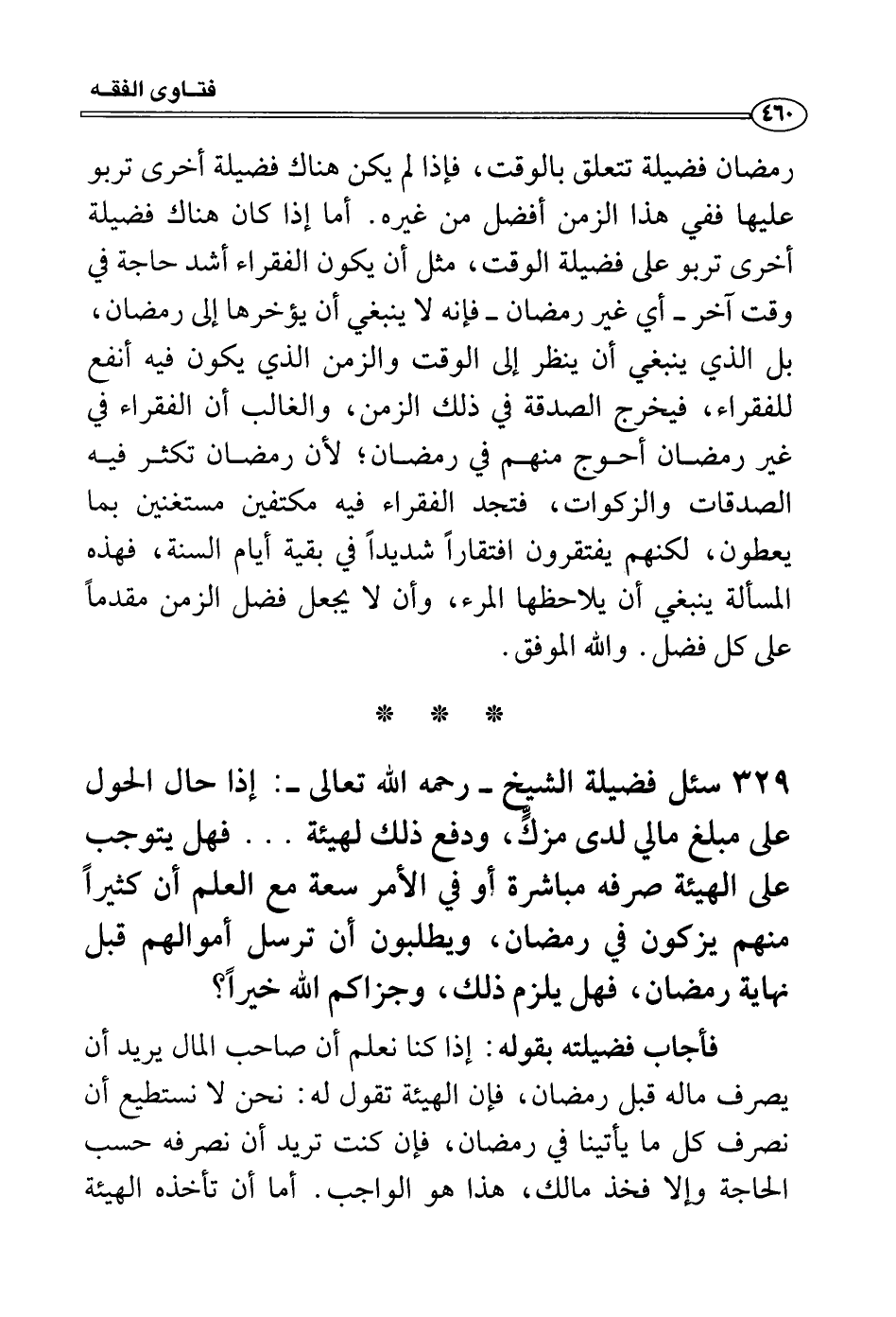 فأجاب فضيلته بقوله: إذا كنا نعلم أن صاحب المال يريد أن يصرف ماله قبل رمضان، فإن الهيئة تقول له: نحن لا نستطيع أن نصرف كل ما يأتينا في رمضان، فإن كنت تريد أن نصرفه حسب الحاجة وإلا فخذ مالك، هذا هو الواجب. أما أن تأخذه الهيئة