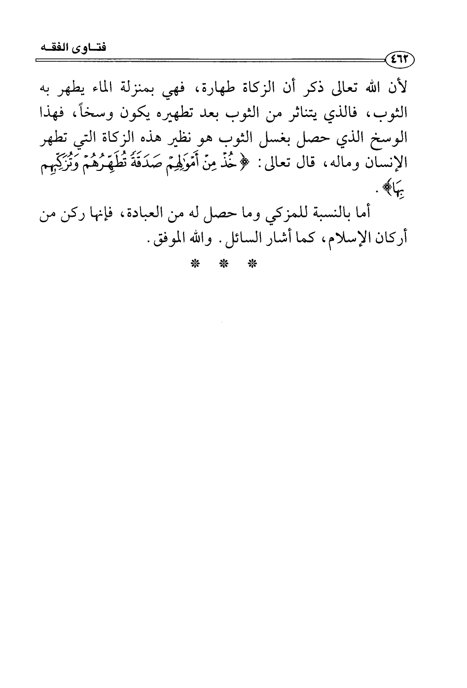 لأن الله تعالى ذكر أن الزكاة طهارة، فهي بمنزلة الماء يطهر به الثوب، فالذي يتناثر من الثوب بعد تطهيره يكون وسخاً، فهذا الوسخ الذي حصل بغسل الثوب هو نظير هذه الزكاة التي تطهر الإنسان وماله، قال تعالى: {خُذْ مِنْ أَمْوَالِهِمْ صَدَقَةً تُطَهِّرُهُمْ وَتُزَكِّيهِمْ بِهَا وَصَلِّ عَلَيْهِمْ إِنَّ صلاتَكَ سَكَنٌ لَّهُمْ وَاللهُ سَمِيعٌ عَلِيمٌ بِهَا وَصَلِّ عَلَيْهِمْ إِنَّ صلاتَكَ سَكَنٌ لَّهُمْ وَاللهُ سَمِيعٌ عَلِيمٌ} .