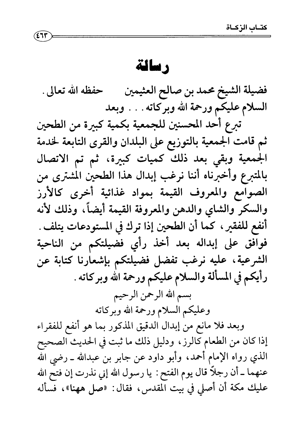 تبرع أحد المحسنين للجمعية بكمية كبيرة من الطحين ثم قامت الجمعية بالتوزيع على البلدان والقرى التابعة لخدمة الجمعية وبقي بعد ذلك كميات كبيرة، ثم تم الاتصال بالمتبرع وأخبرناه أننا نرغب إبدال هذا الطحين المشترى من الصوامع والمعروف القيمة بمواد غذائية أخرى كالأرز والسكر والشاي والدهن والمعروفة القيمة أيضاً، وذلك لأنه أنفع للفقير، كما أن الطحين إذا ترك في المستودعات يتلف. فوافق على إبداله بعد أخذ رأي فضيلتكم من الناحية الشرعية، عليه نرغب تفضل فضيلتكم بإشعارنا كتابة عن رأيكم في المسألة والسلام عليكم ورحمة الله وبركاته.