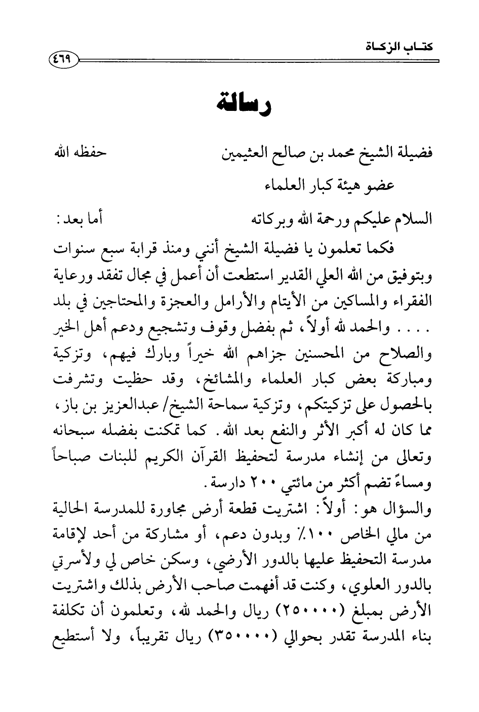 فكما تعلمون يا فضيلة الشيخ أنني ومنذ قرابة سبع سنوات وبتوفيق من الله العلي القدير استطعت أن أعمل في مجال تفقد ورعاية الفقراء والمساكين من الأيتام والأرامل والعجزة والمحتاجين في بلد.... والحمد لله أولاً، ثم بفضل وقوف وتشجيع ودعم أهل الخير والصلاح من المحسنين جزاهم الله خيراً وبارك فيهم، وتزكية ومباركة بعض كبار العلماء والمشائخ، وقد حظيت وتشرفت بالحصول على تزكيتكم، وتزكية سماحة الشيخ/عبد العزيز بن باز، مما كان له أكبر الأثر والنفع بعد الله. كما تمكنت بفضله سبحانه وتعالى من إنشاء مدرسة لتحفيظ القرآن الكريم للبنات صباحاً ومساءً تضم أكثر من مائتي 002 دارسة.