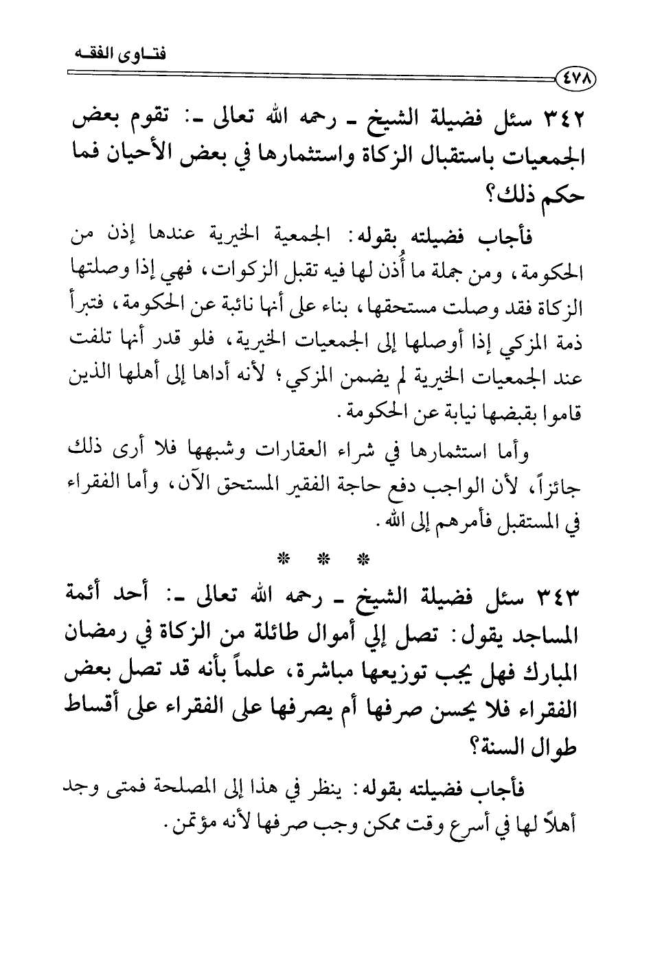 سئل فضيلة الشيخ - رحمه الله تعالى -: تقوم بعض الجمعيات باستقبال الزكاة واستثمارها في بعض الأحيان فما حكم ذلك؟