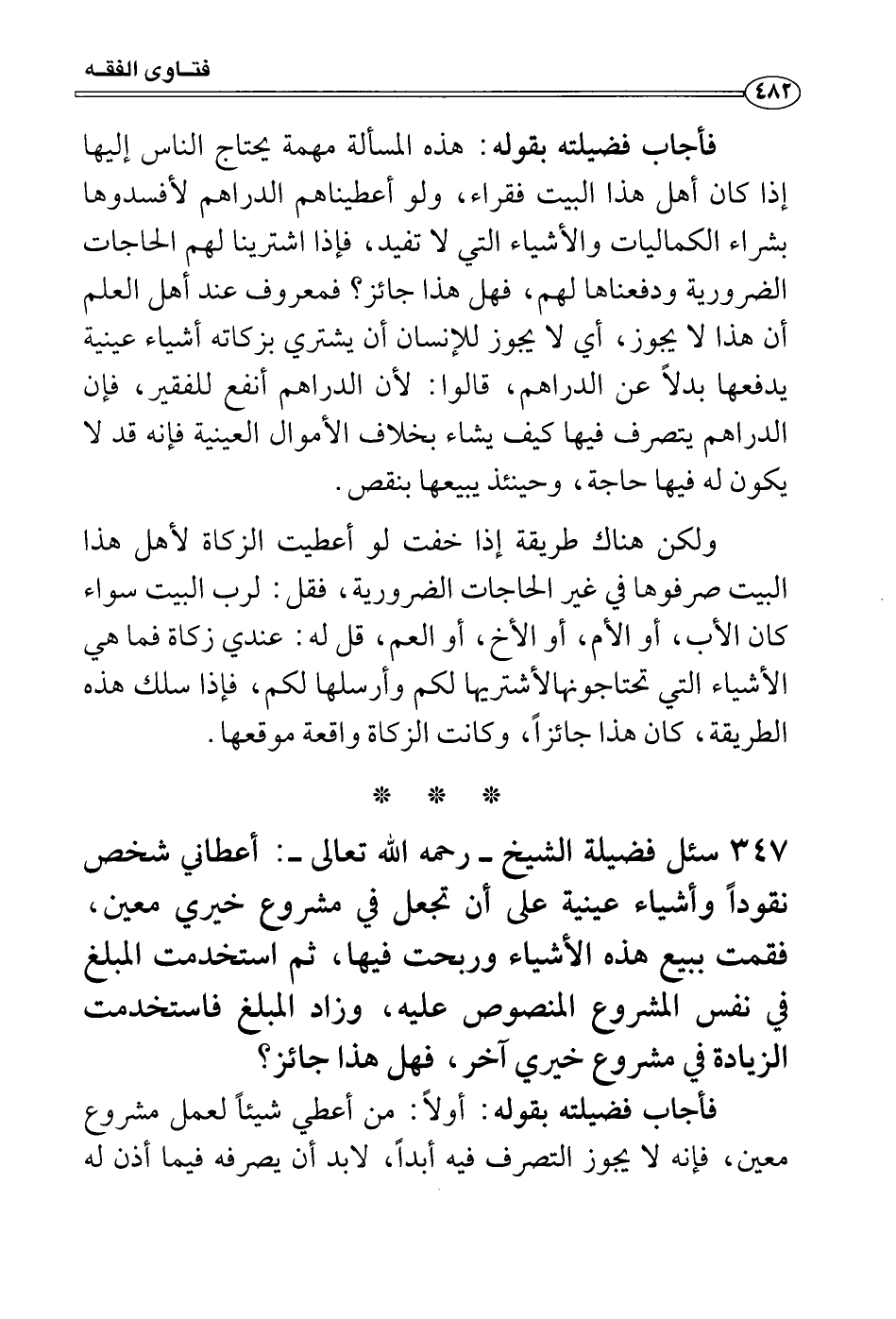 فأجاب فضيلته بقوله: هذه المسألة مهمة يحتاج الناس إليها إذا كان أهل هذا البيت فقراء، ولو أعطيناهم الدراهم لأفسدوها بشراء الكماليات والأشياء التي لا تفيد، فإذا اشترينا لهم الحاجات الضرورية ودفعناها لهم، فهل هذا جائز؟ فمعروف عند أهل العلم أن هذا لا يجوز، أي لا يجوز للإنسان أن يشتري بزكاته أشياء عينية يدفعها بدلاً عن الدراهم، قالوا: لأن الدراهم أنفع للفقير، فإن الدراهم يتصرف فيها كيف يشاء بخلاف الأموال العينية فإنه قد لا يكون له فيها حاجة، وحينئذ يبيعها بنقص.