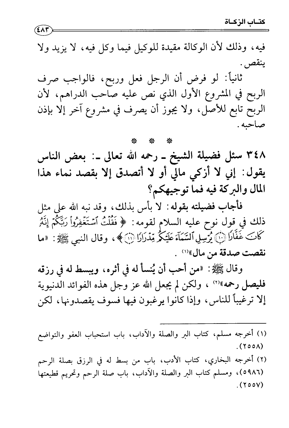 فأجاب فضيلته بقوله: لا بأس بذلك، وقد نبه الله على مثل ذلك في قول نوح عليه السلام لقومه: {فَقُلْتُ اسْتَغْفِرُواْ رَبَّكُمْ إِنَّهُ كَانَ غَفَّاراً * يُرْسِلِ السَّمَآءَ عَلَيْكُمْ مُدْرَاراً} ، وقال النبي صَلَّى اللَّهُ عَلَيْهِ وَسَلَّمَ: «ما نقصت صدقة من مال» .