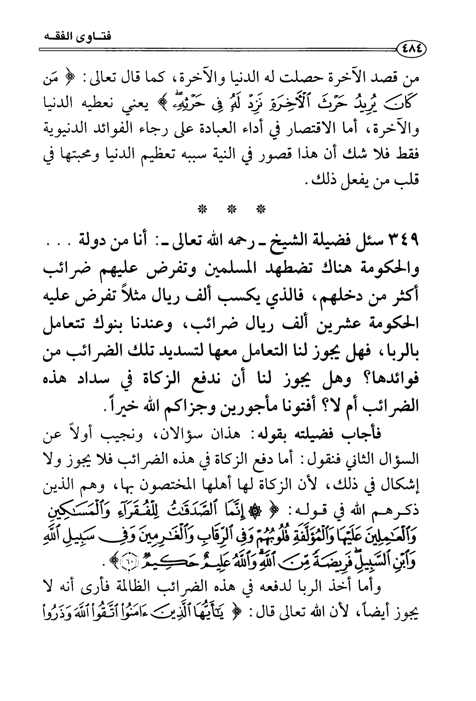 سئل فضيلة الشيخ - رحمه الله تعالى -: أنا من دولة ... والحكومة هناك تضطهد المسلمين وتفرض عليهم ضرائب أكثر من دخلهم، فالذي يكسب ألف ريال مثلاً تفرض عليه الحكومة عشرين ألف ريال ضرائب، وعندنا بنوك تتعامل بالربا، فهل يجوز لنا التعامل معها لتسديد تلك الضرائب من فوائدها؟ وهل يجوز لنا أن ندفع الزكاة في سداد هذه الضرائب أم لا؟ أفتونا مأجورين وجزاكم الله خيراً.
