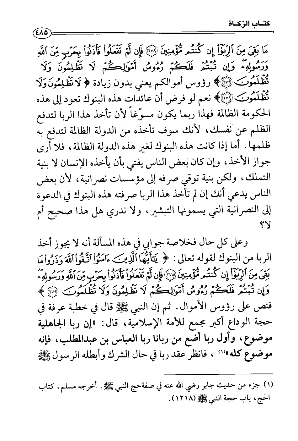 مَا بَقِىَ مِنَ الرِّبَوااْ إِن كُنتُمْ مُّؤْمِنِينَ مَا بَقِىَ مِنَ الرِّبَوااْ إِن كُنتُمْ مُّؤْمِنِينَ * فَإِن لَّمْ تَفْعَلُواْ فَأْذَنُواْ بِحَرْبٍ مِّنَ اللهِوَرَسُولِهِ وَإِن تُبتُمْ فَلَكُمْ رُءُوسُ أَمْوَالِكُمْ لاَ تَظْلِمُونَ وَلاَ تُظْلَمُونَ تُظْلَمُونَ} رؤوس أموالكم يعني بدون زيادة {لاَ تَظْلِمُونَ وَلاَ تُظْلَمُونَ} نعم لو فرض أن عائدات هذه البنوك تعود إلى هذه الحكومة الظالمة فهذا ربما يكون مسوّغاً لأن تأخذ هذا الربا لتدفع الظلم عن نفسك، لأنك سوف تأخذه من الدولة الظالمة لتدفع به ظلمها. أما إذا كانت هذه البنوك لغير هذه الدولة الظالمة، فلا أرى جواز الأخذ، وإن كان بعض الناس يفتي بأن يأخذه الإنسان لا بنية التملك، ولكن بنية توقي صرفه إلى مؤسسات نصرانية، لأن بعض الناس يدعي أنك إن لم تأخذ هذا الربا صرفته هذه البنوك في الدعوة إلى النصرانية التي يسمونها التبشير، ولا ندري هل هذا صحيح أم لا؟