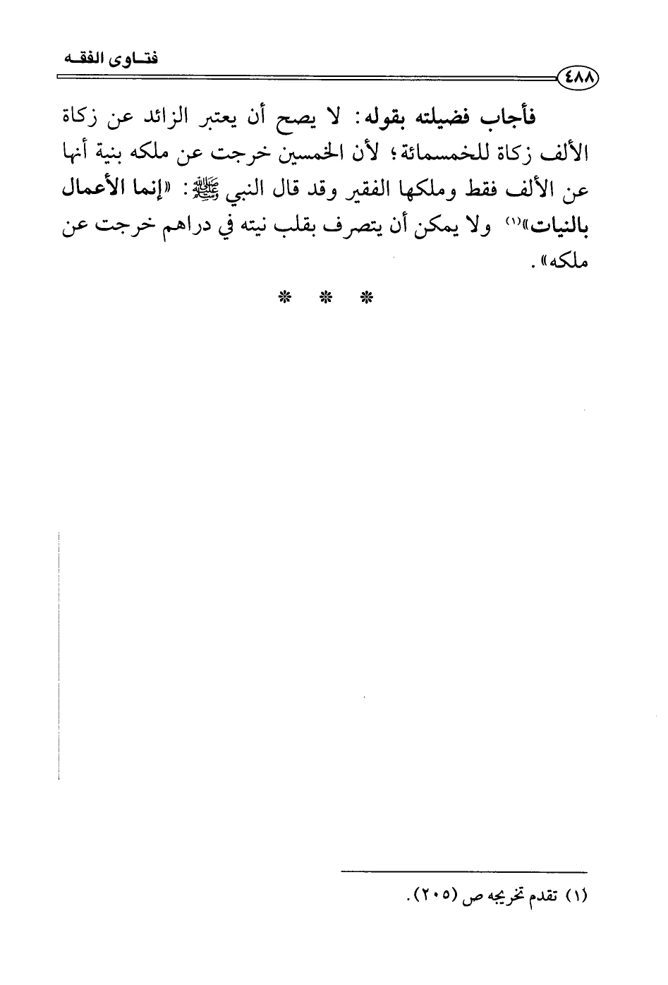 فأجاب فضيلته بقوله: لا يصح أن يعتبر الزائد عن زكاة الألف زكاة للخمسمائة؛ لأن الخمسين خرجت عن ملكه بنية أنها عن الألف فقط وملكها الفقير وقد قال النبي صَلَّى اللَّهُ عَلَيْهِ وَسَلَّمَ: «إنما الأعمال بالنيات» ولا يمكن أن يتصرف بقلب نيته في دراهم خرجت عن ملكه» .