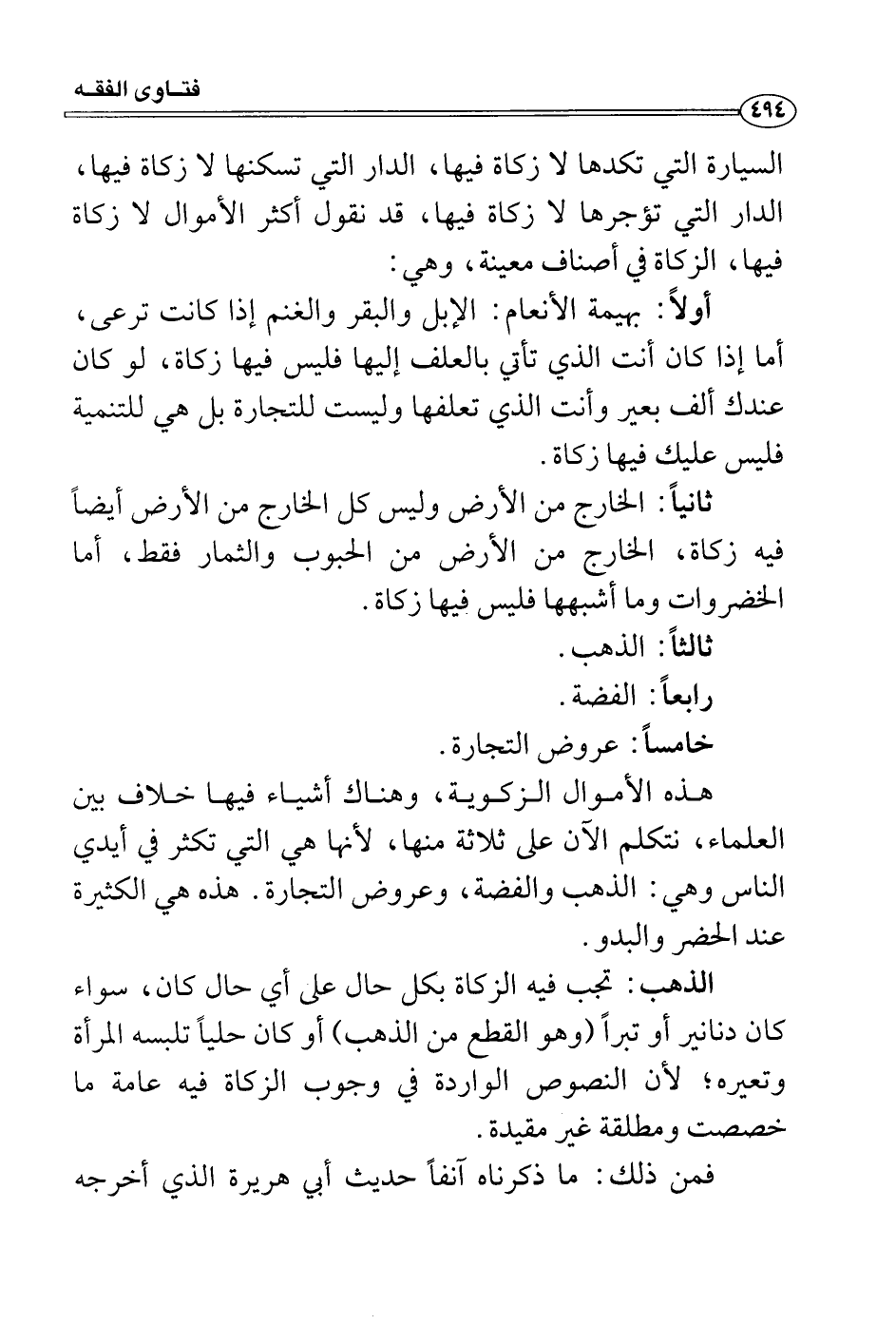 هذه الأموال الزكوية، وهناك أشياء فيها خلاف بين العلماء، نتكلم الآن على ثلاثة منها، لأنها هي التي تكثر في أيدي الناس وهي: الذهب والفضة، وعروض التجارة. هذه هي الكثيرة عند الحضر والبدو.