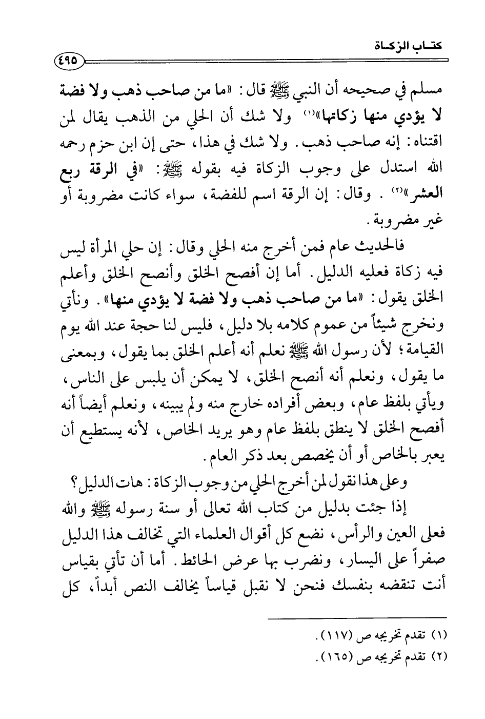 فالحديث عام فمن أخرج منه الحلي وقال: إن حلي المرأة ليس فيه زكاة فعليه الدليل. أما إن أفصح الخلق وأنصح الخلق وأعلم الخلق يقول: «ما من صاحب ذهب ولا فضة لا يؤدي منها» . ونأتي ونخرج شيئاً من عموم كلامه بلا دليل، فليس لنا حجة عند الله يوم القيامة؛ لأن رسول الله صَلَّى اللَّهُ عَلَيْهِ وَسَلَّمَ نعلم أنه أعلم الخلق بما يقول، وبمعنى ما يقول، ونعلم أنه أنصح الخلق، لا يمكن أن يلبس على الناس، ويأتي بلفظ عام، وبعض أفراده خارج منه ولم يبينه، ونعلم أيضاً أنه أفصح الخلق لا ينطق بلفظ عام وهو يريد الخاص، لأنه يستطيع أن يعبر بالخاص أو أن يخصص بعد ذكر العام.