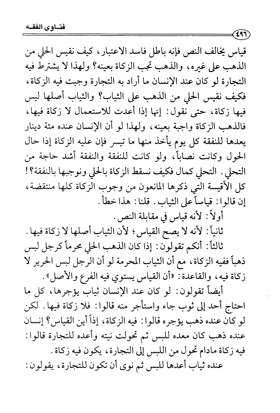 قياس يخالف النص فإنه باطل فاسد الاعتبار، كيف نقيس الحلي من الذهب على غيره، والذهب تجب الزكاة بعينه؟ ولهذا لا يشترط فيه التجارة لو كان عند الإنسان ما أراد به التجارة وجبت فيه الزكاة، فكيف نقيس الحلي من الذهب على الثياب؟ والثياب أصلها ليس فيها زكاة، حتى نقول: إنها إذا أعدت للاستعمال لا زكاة فيها، فالذهب الزكاة واجبة بعينه، ولهذا لو أن الإنسان عنده مئة دينار يعدها للنفقة كل يوم يأخذ منها ما تيسر فإن عليه الزكاة إذا حال الحول وكانت نصاباً، ولو كانت للنفقة والنفقة أشد حاجة من التحلي. التحلي كمال فكيف نسقط الزكاة بالحلي ونوجبها بالنفقة؟! كل الأقيسة التي ذكرها المانعون من وجوب الزكاة كلها منتقضة، إن قالوا: قياساً على الثياب. قلنا: هذا خطأ.
