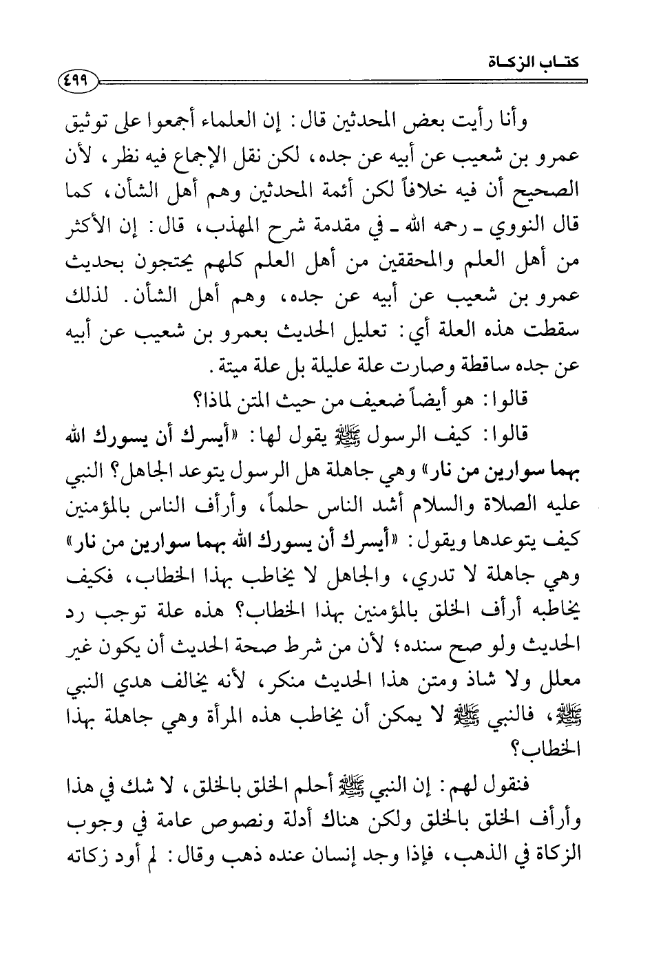قالوا: كيف الرسول صَلَّى اللَّهُ عَلَيْهِ وَسَلَّمَ يقول لها: «أيسرك أن يسورك الله بهما سوارين من نار» وهي جاهلة هل الرسول يتوعد الجاهل؟ النبي عليه الصلاة والسلام أشد الناس حلماً، وأرأف الناس بالمؤمنين كيف يتوعدها ويقول: «أيسرك أن يسورك الله بهما سوارين من نار» وهي جاهلة لا تدري، والجاهل لا يخاطب بهذا الخطاب، فكيف يخاطبه أرأف الخلق بالمؤمنين بهذا الخطاب؟ هذه علة توجب رد الحديث ولو صح سنده؛ لأن من شرط صحة الحديث أن يكون غير معلل ولا شاذ ومتن هذا الحديث منكر، لأنه يخالف هدي النبي صَلَّى اللَّهُ عَلَيْهِ وَسَلَّمَ، فالنبي صَلَّى اللَّهُ عَلَيْهِ وَسَلَّمَ لا يمكن أن يخاطب هذه المرأة وهي جاهلة بهذا الخطاب؟