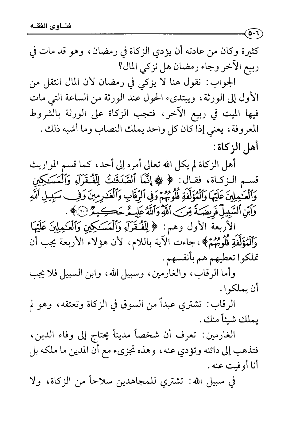 الأربعة الأول وهم: {لِلْفُقَرَآءِ وَالْمَسَاكِينِ وَالْعَامِلِينَ عَلَيْهَا وَالْمُؤَلَّفَةِ قُلُوبُهُمْ وَفِى الرِّقَابِ وَالْغَارِمِينَ وَفِى سَبِيلِ اللهِ وَابْنِ السَّبِيلِ فَرِيضَةً مِّنَ اللهِ وَاللهُ عَلِيمٌ حَكِيمٌ} ،جاءت الآية باللام، لأن هؤلاء الأربعة يجب أن تملكوا تعطيهم هم بأنفسهم.